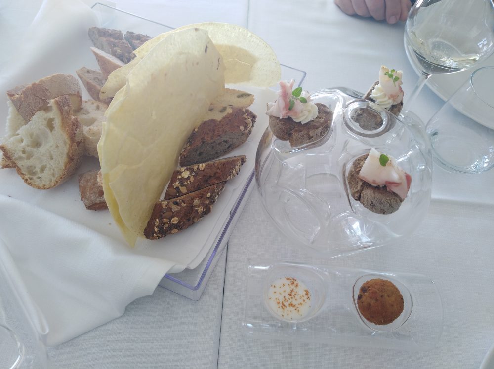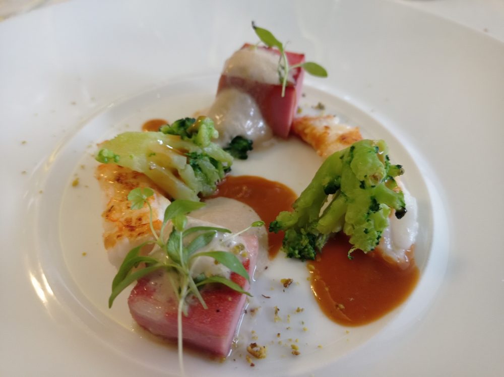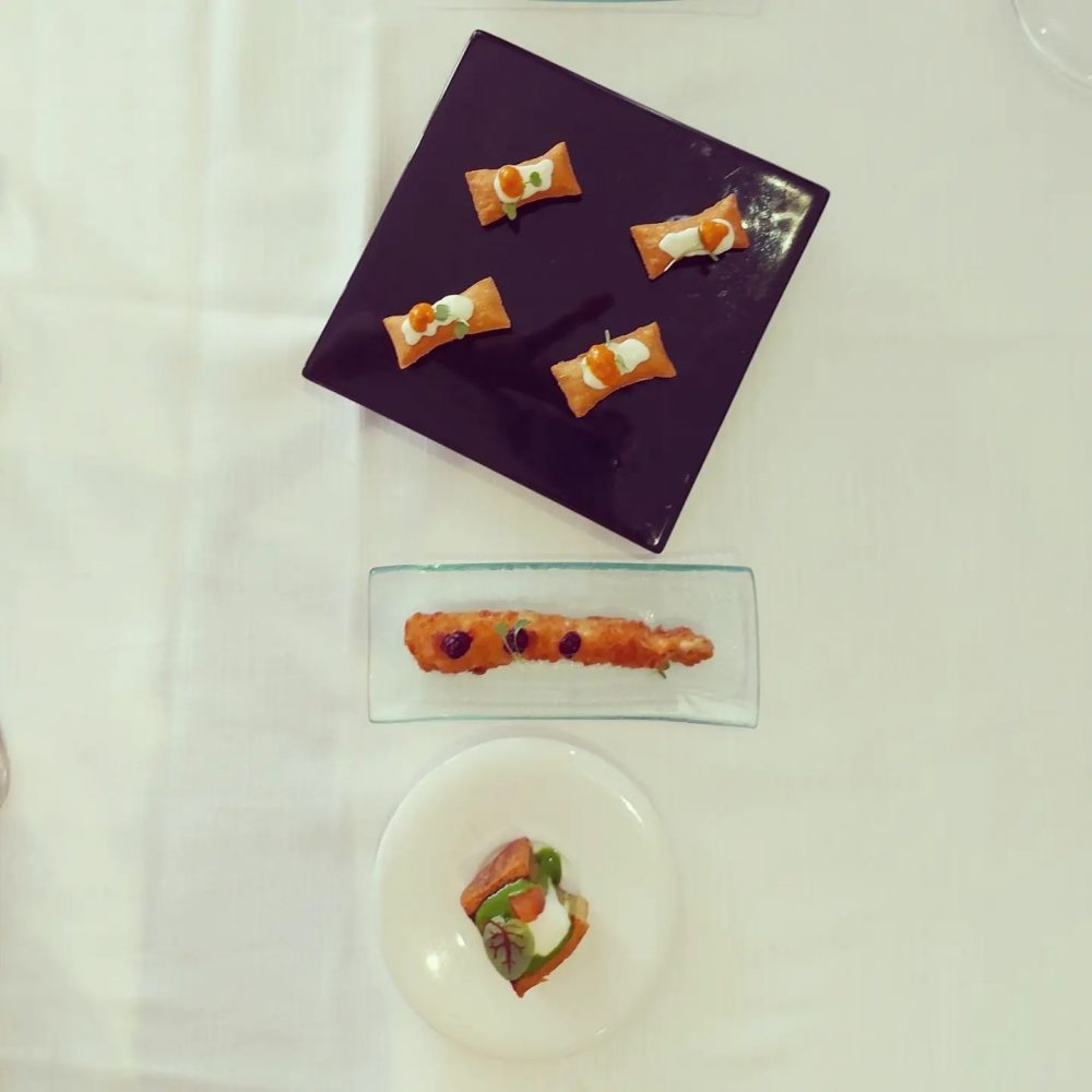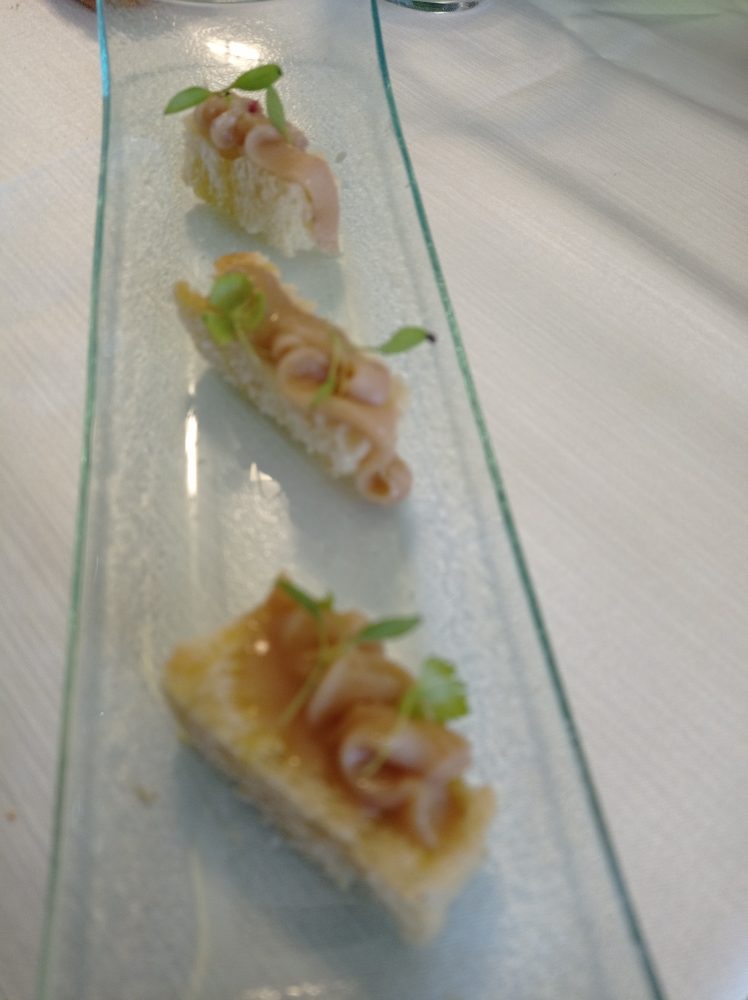 Come al solito s’incomincia con vari e gradevoli stuzzichini: pinchos al crudo di Parma con burratina e vin cotto e montanarina; ostrica di Marrenes-Olèron al pane pancettato, pomodorino e clorofilla di prezzemolo al lime; mazzancolla al pane panko con pomodoro yuzu e caviale; pane, burro e alici; schioppetto di mare con yogurt acido e caffè. Sfaccettata e sublime l’estrazione di sapori così ben delineati ed equilibrati tra di loro, frutto di una miscellanea di amalgamati e variegati ingredienti che incontrano il favore del palato.
