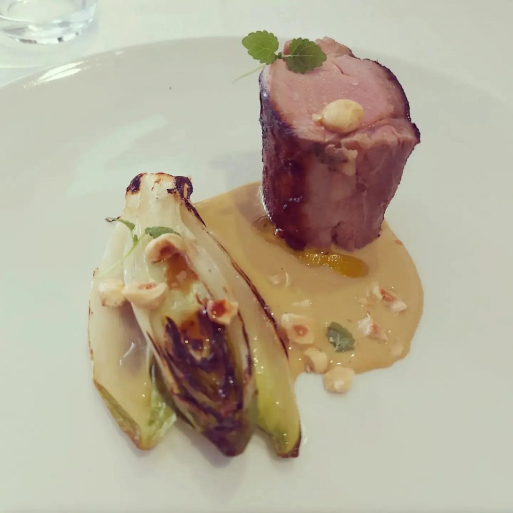 Cottura millimetrica per il maialino accompagnato da salsa alla nocciola, indivia grigliata, senape e mela verde.