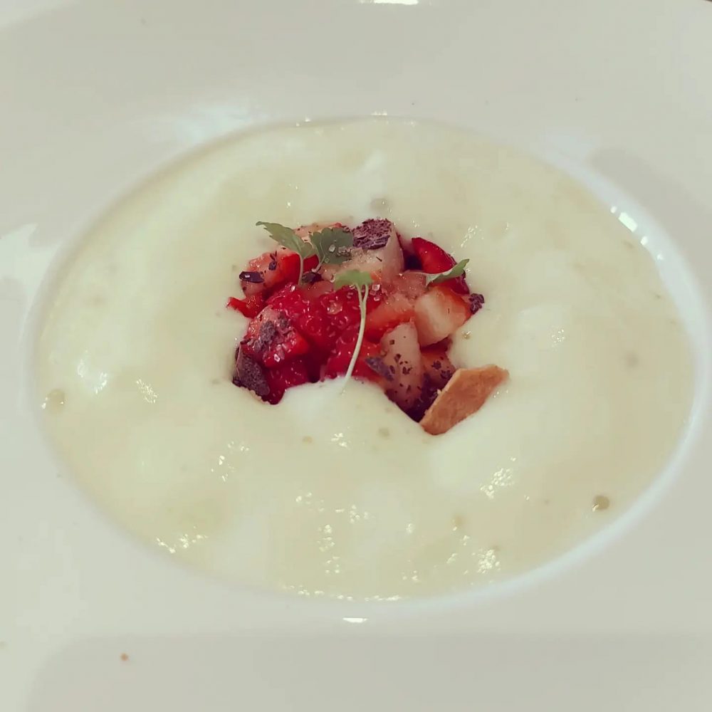 Fresco e intrigante il primo antipasto, crème brûlée di ceci in salsa fava con salsa guacamole, fragole e sedano croccante, un mix di ingredienti accostati con grande equilibrio, dunque abbinamenti solo apparentemente azzardati ma nei fatti un piatto…emozionante.