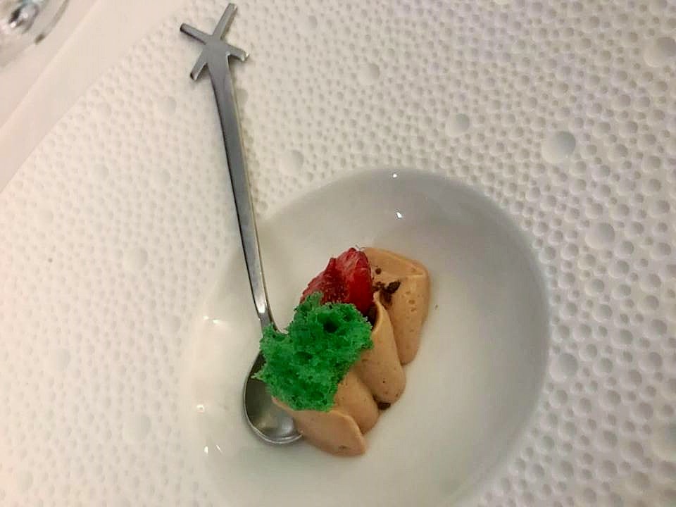 La parte dolce è annunciata da un predessert dolce- salato: una mousse al cioccolato al latte e capperi, crumble al cioccolato salato, lamponi, spugna alla menta e pistacchio.