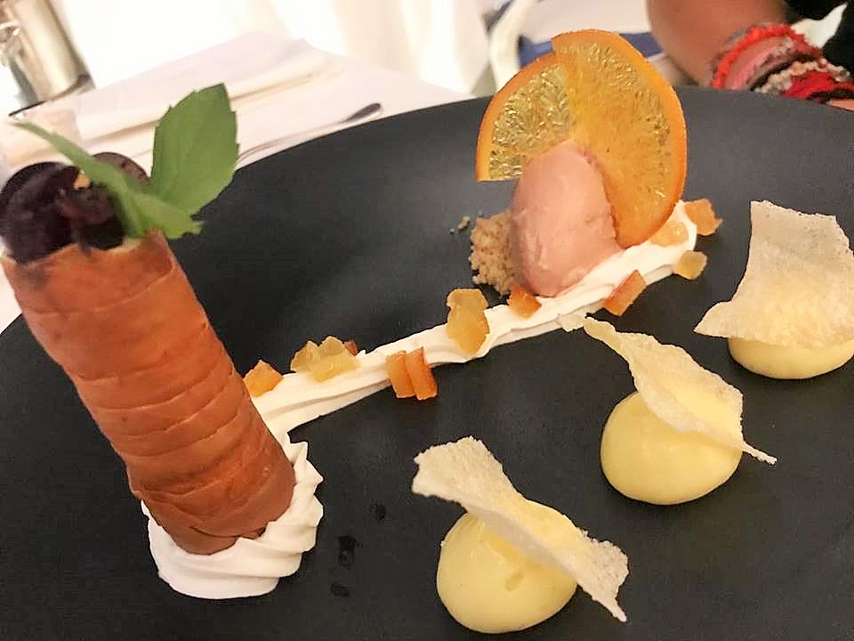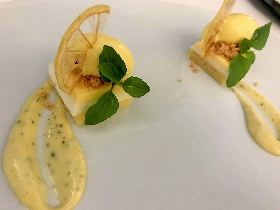 “Amalfi” è il dolce al limone scomposto, in diverse consistenze. C’è la madeleine al limone e olio extravergine di oliva, la bavarese alle mandorle, il gelato allo zafferano, la menta ed il re degli agrumi costieri, lo sfusato amalfitano, a trionfare su tutto.
