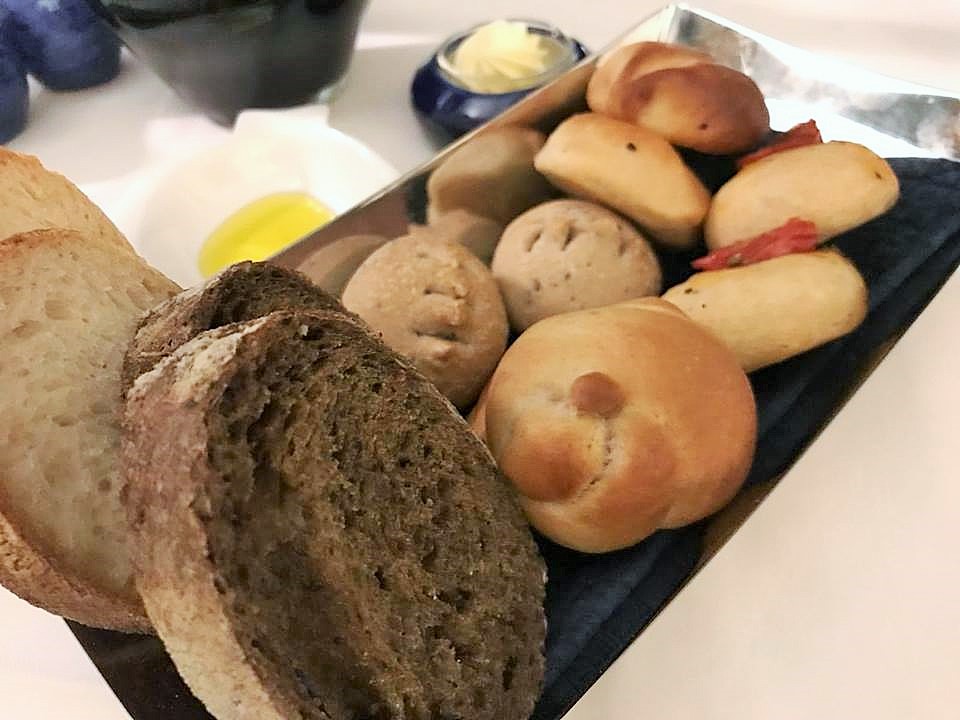 Mise en place elegante nei toni del bianco e del blu, partenza con il burro di Normandia e l’olio Torretta che accompagnano la selezione di pani: alle olive, alle alici, al lardo , ai pomodorini, bianco e ai sette cereali.