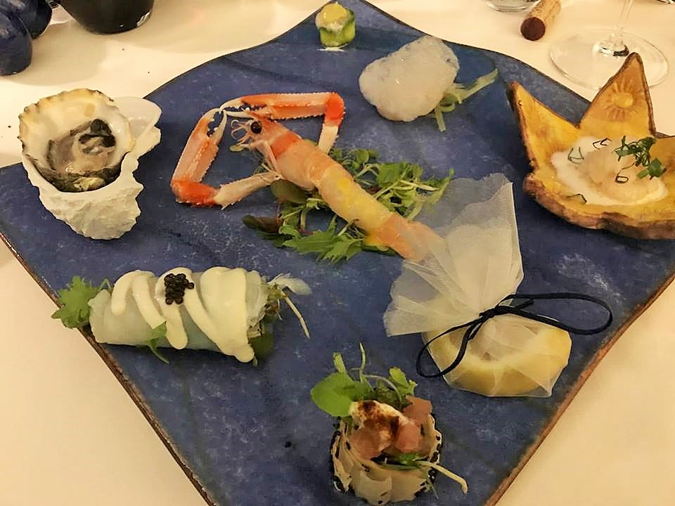 Gamberetti di nassa su salsa di mandorle, tartare con burrata e liquirizia in pasta fillo e semi di sesamo nero; poi carpaccio di baccalà con crema di yogurt, cavolfiore e caviale; un’ostrica; capasanta con gelatina di limoncello; gamberi con salsa di avocado e scampo con una salsa di frutto della passione.