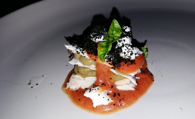 Parmigiana di alici fredda gazpacho di pomodoro San Marzano salsa di melenzana affumicata e mozzarella di bufala