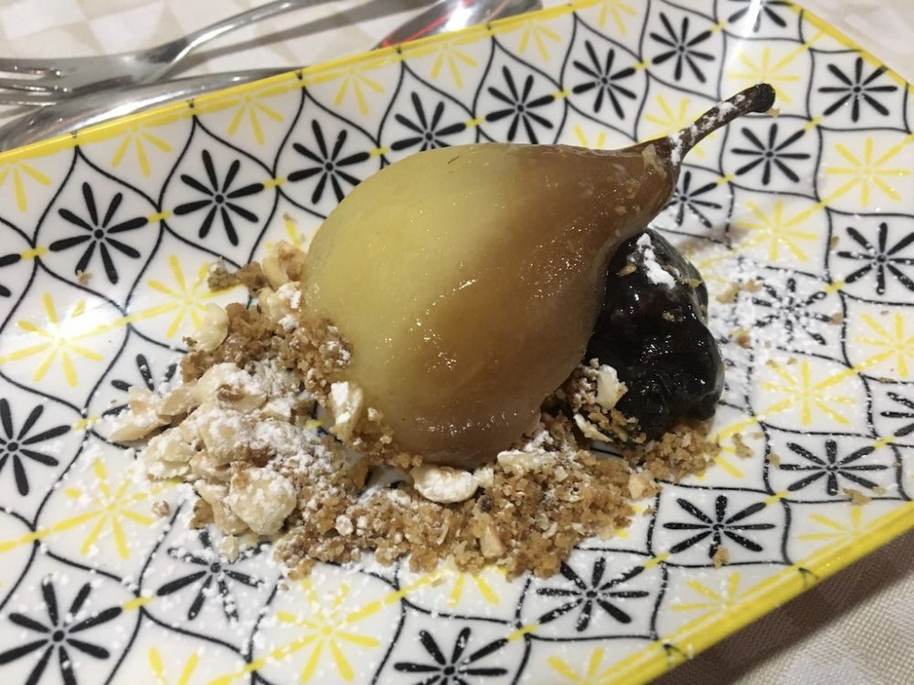 Uno strudel di scarole e si passa alla pera poché (veganizzata solo sostituendo il biscotto previsto con un crumble all’olio vegetale preparato al momento).
