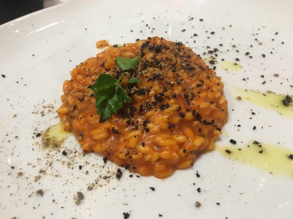 Verdure dell’orto di famiglia per l’antipasto. Dei mezzanelli fintamente lardiati dove il grasso delle olive sostituisce quello di maiale e lo chef lo racconta per quella che è: una semplice sostituzione che varia sì il sapore ma non i principi su cui si basa il piatto. Portata della giornata è certamente il Risotto Mozzafiato, accidentalmente vegan in carta: sapido, con una persistenza lunghissima e una esecuzione perfetta per un piatto dalla spiccata acidità: contemporaneo e della memoria al tempo stesso.