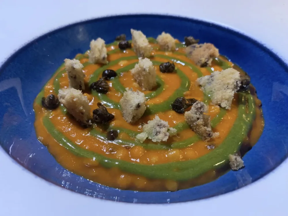 Hydra a Salerno, Fregola, acqua di peperoni, crumble alle olive e capperi fritti
