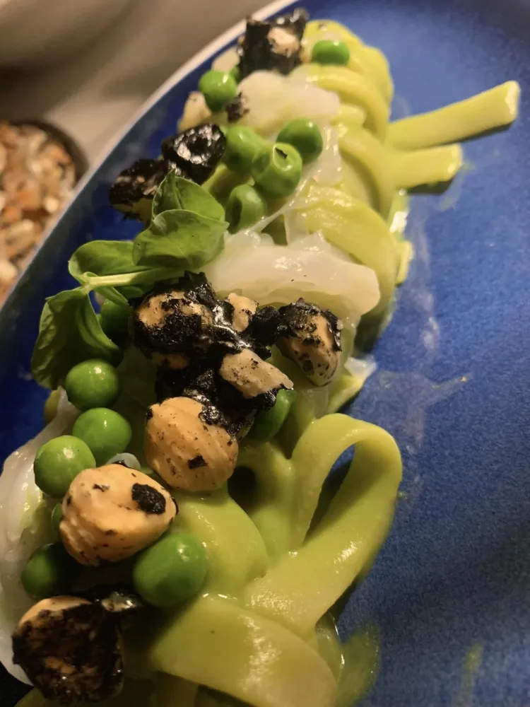 Hydra a Salerno, Tagliatelle, seppie, piselli e nocciola al nero