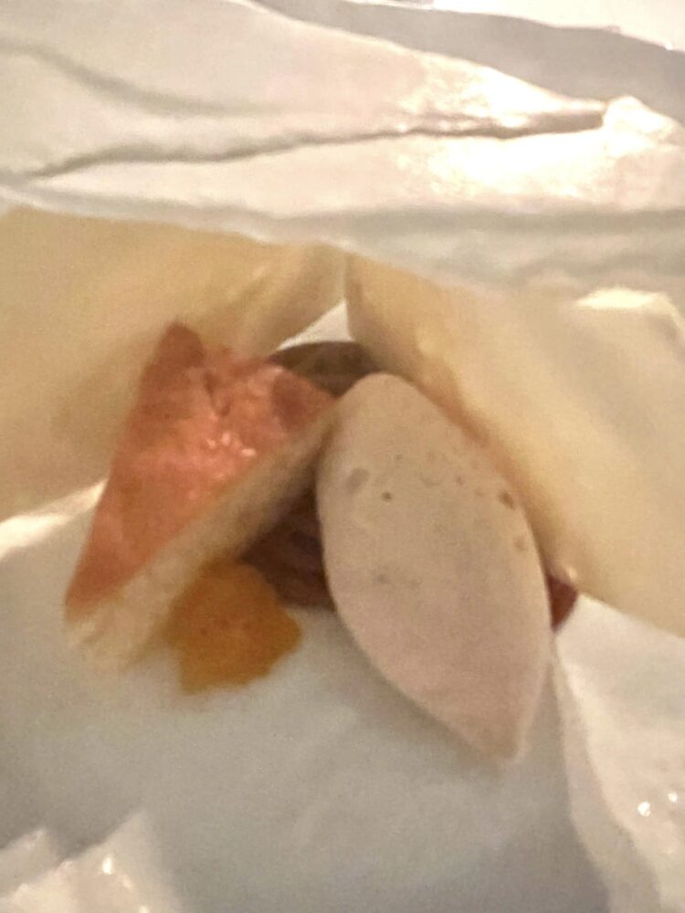 Esotica provocazione in tre consistenze, col frutto al naturale, in chips e fermentato che si risolve in un piatto dagli equilibri molto fini. Un piatto difficile che potrebbe passar per pretenzioso: in realtà si tratta di un capolavoro del giovane romano, voluttuoso e ricco, tra curry e cetriolo marinato, di nuances, di percezioni. Stupendo.