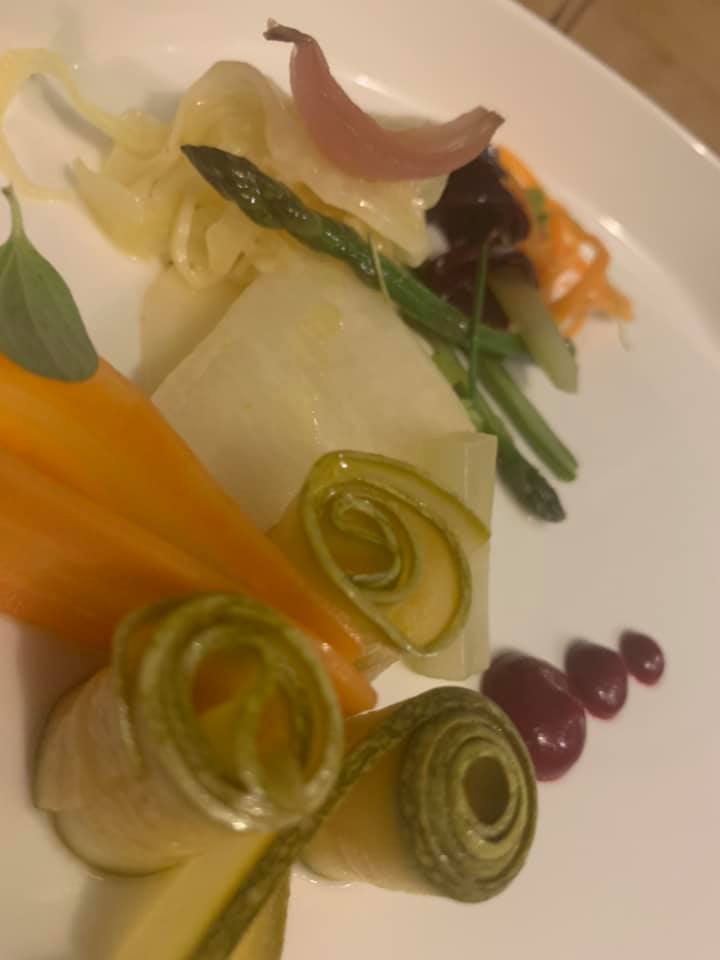 Il menu, che cambia cinque volte all’anno, segue la stagionalità dei prodotti e include piatti preparati con ortaggi per la maggior parte di produzione propria.