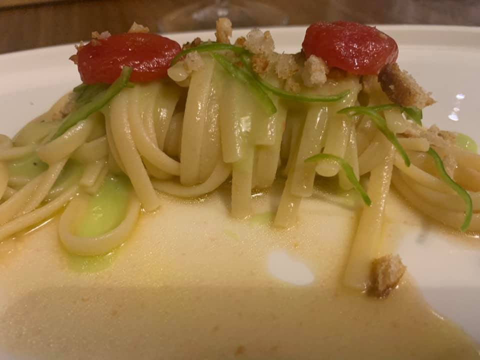 Il Principe – Linguine alla colatura di alici di Cetara, salsa di friggitelli, datterino candito, pane aromatico alle erbe