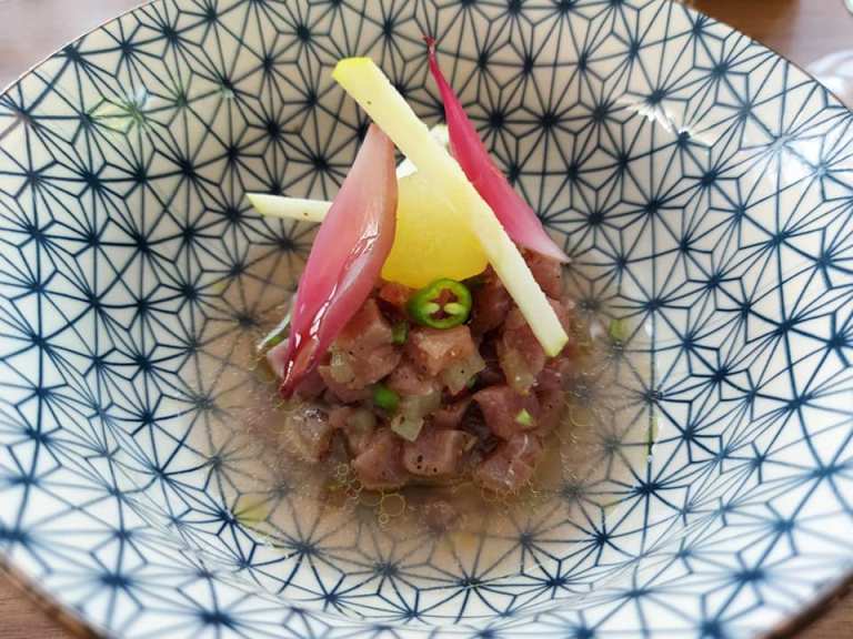 Spiccata acidità e freschezza nel primo antipasto, ceviche di tonno rosso, mela verde al cetriolo, cetriolo alla mela verde e peperoncino.
