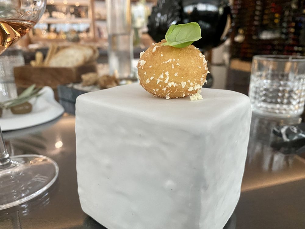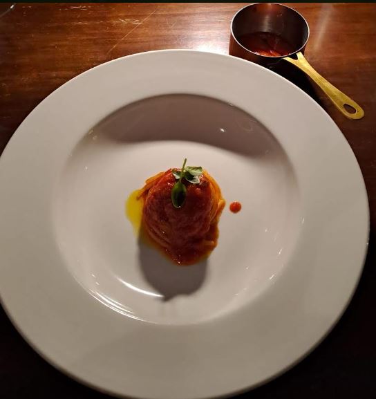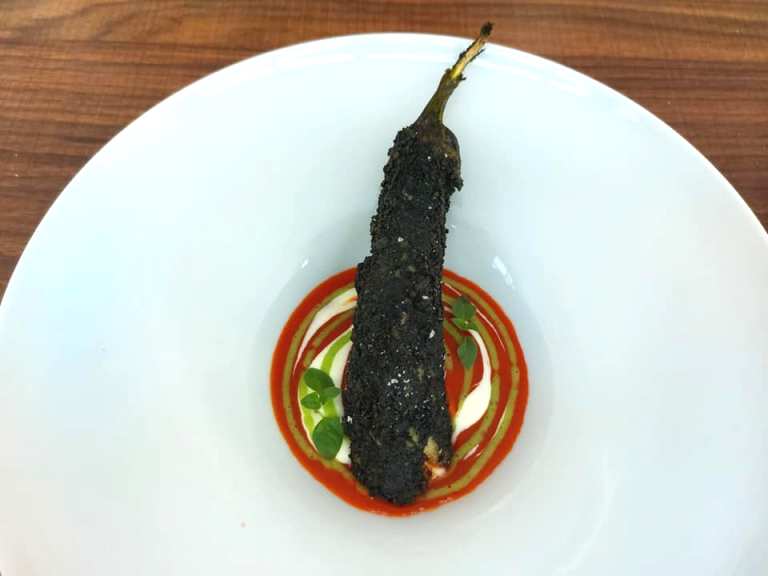 L’altro antipasto assaggiato è la Melanzana alla parmigiana, una creazione che conserva perfettamente l’autenticità della tradizione pur rendendo l’ortaggio protagonista assoluto. Qui la melanzana è tagliata e farcita con un ripieno di parmigiana di melanzana, poi riassemblata e ricoperta di pane panko e della buccia disidratata e ridotta in polvere.