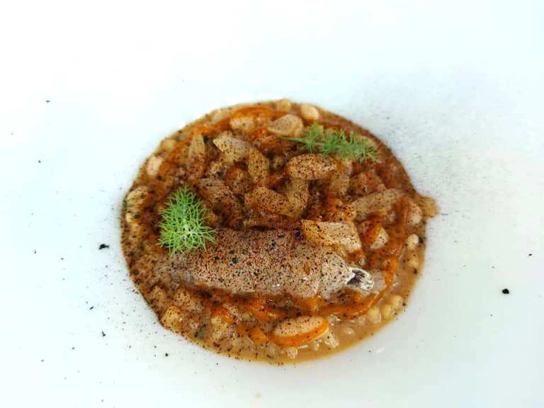 Il Principe, Tubettini in ragu’ di canocchie, salsa di carota arrosto affumicata, fagioli cannellini, sedano fermentato e aglio nero