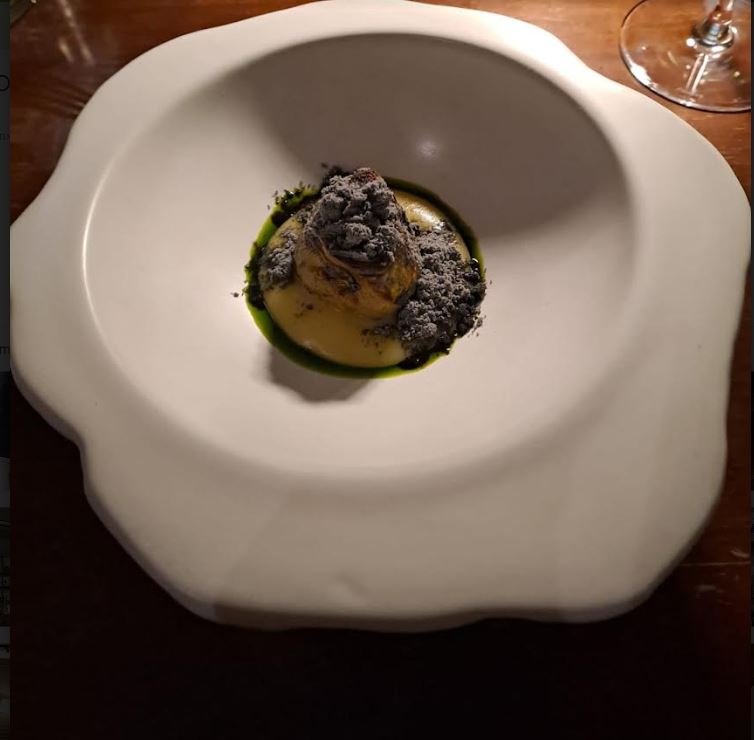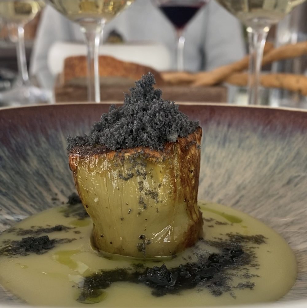 L’antipasto di Carciofo alla griglia, al forno e cotto poi a bassa temperatura, servito con la sua cenere sul letto di vellutata di patate affumicata, davvero gustoso.