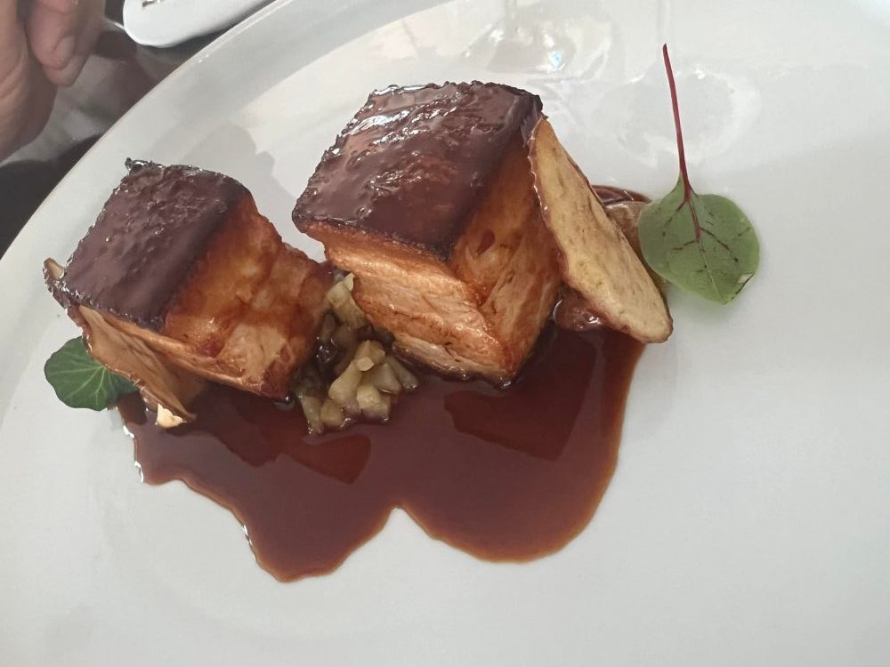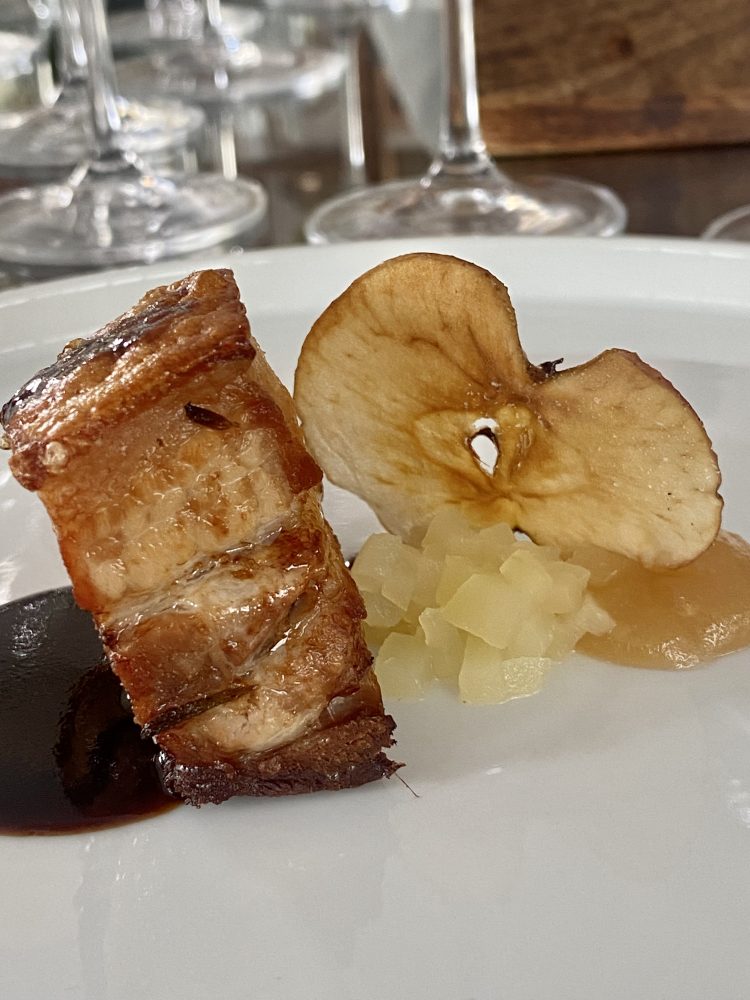 Il-Principe Pancia di maialino in lenta cottura chutney di mela fuji, tartare di mela verde marinata zenzero e cannella.Croccante di mela red e jus alle mele annurche