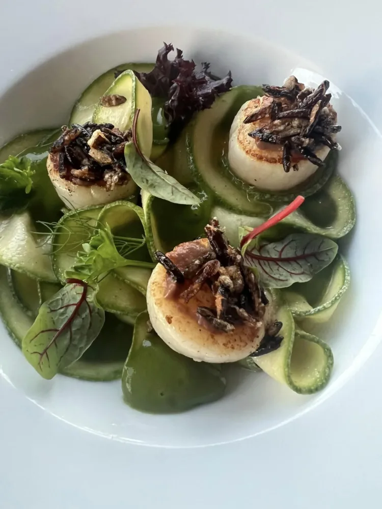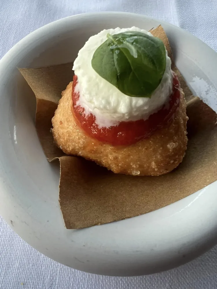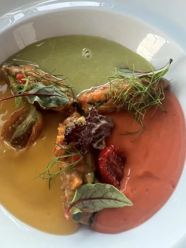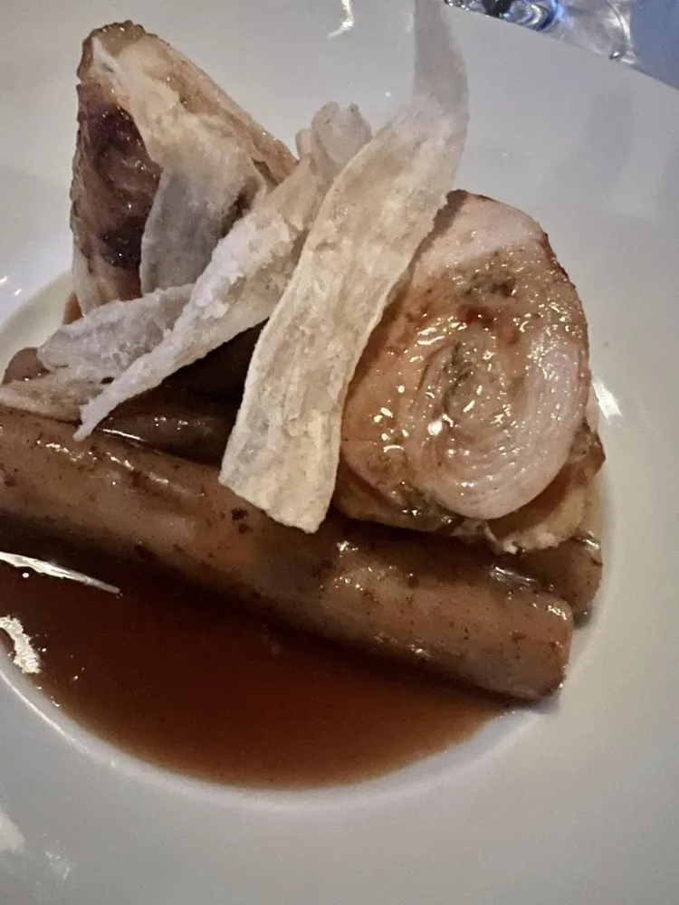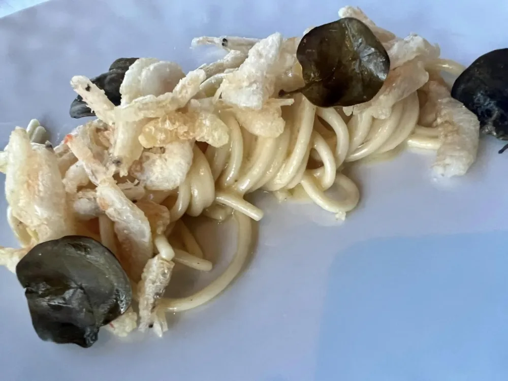 Iniziamo la nostra degustazione con una rivisitazione di un piatto tipico toscano: la cecina. Lo chef Ballarino ne propone una versione contemporanea presentando una cecina soffiata, fagioli rossi ed erbette alla beccafico. Il piatto in sé risulta di un buon impatto visivo e cromatico. Pur essendo soffiata, la cecina rispetta il gusto del piatto originale e le erbette alla beccafico danno quella spinta al piatto che lo rende accattivante anche al palato.