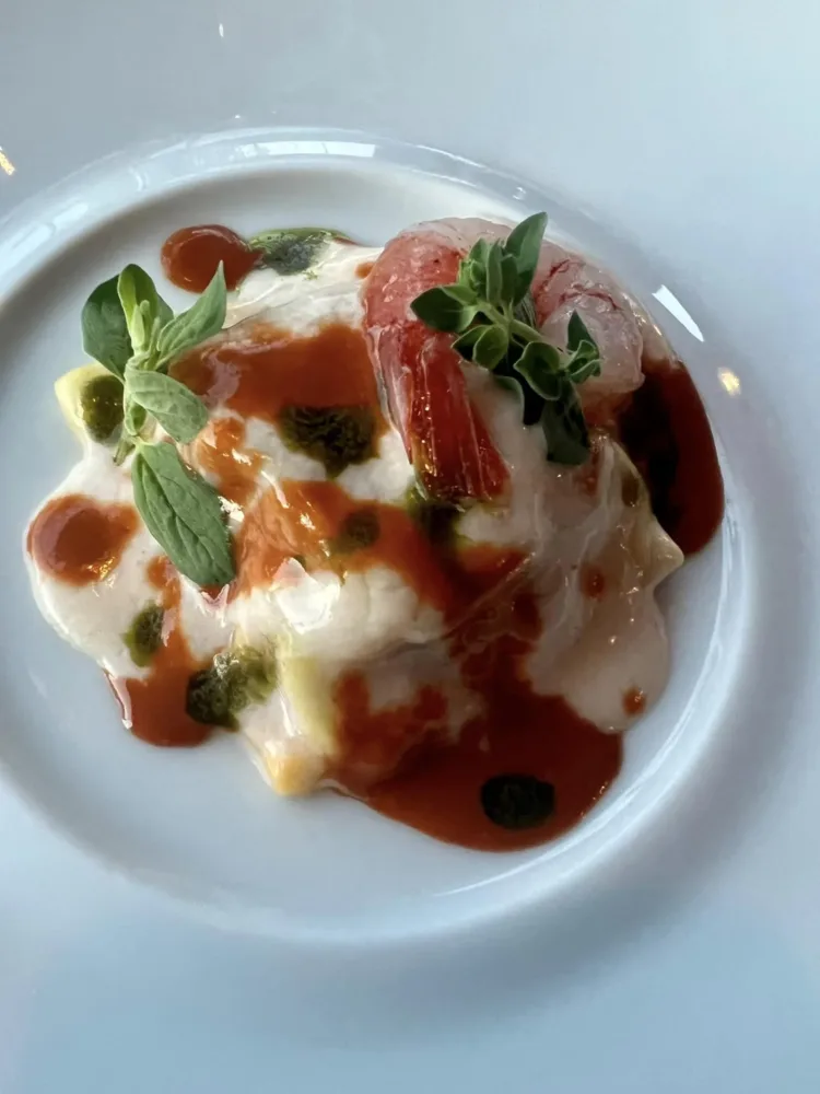 Veniamo ad uno dei piatti che abbiamo apprezzato maggiormente nella degustazione: orecchiette cavoli e pane che abbiamo scherzosamente ribattezzato da Nord a Sud. Qui lo chef reinterpreta con maestria le orecchiette con le cime di rapa mettendo però un twist delle sue origini trentine. Al posto delle cime di rapa troviamo il verzotto. La cottura della pasta è perfetta, la verza da quel tocco di amaricante – anche se ovviamente meno intensa delle cime di rapa in inverno – ed il pane chiude il cerchio regalando al piatto quel morso goloso che t’invoglia al successivo.