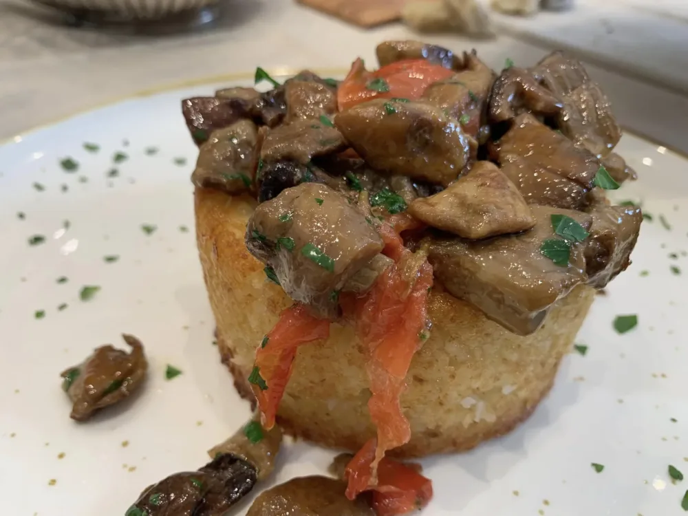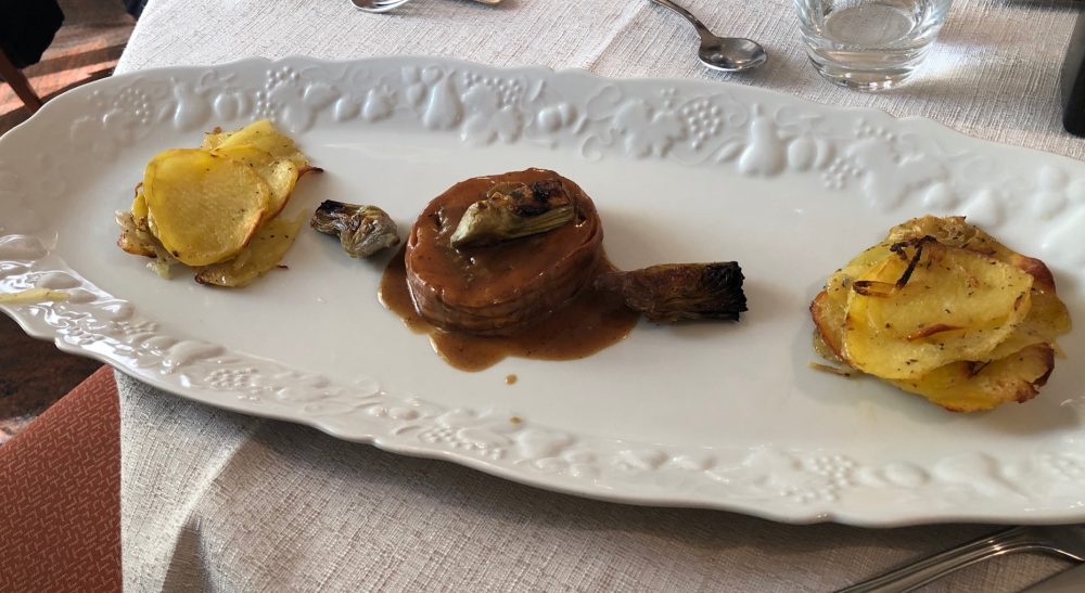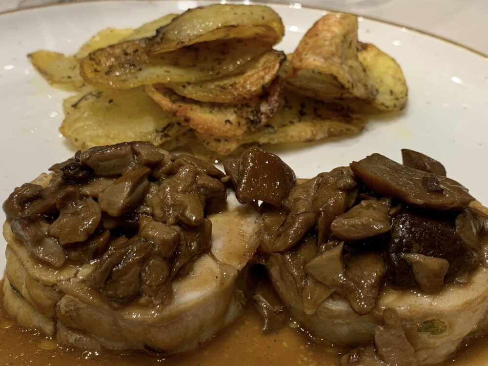 Ristorante La Chioccia d’Oro Coniglio disossato e farcito con funghi porcini e carciofi e accompagnamento di patate arrecanate