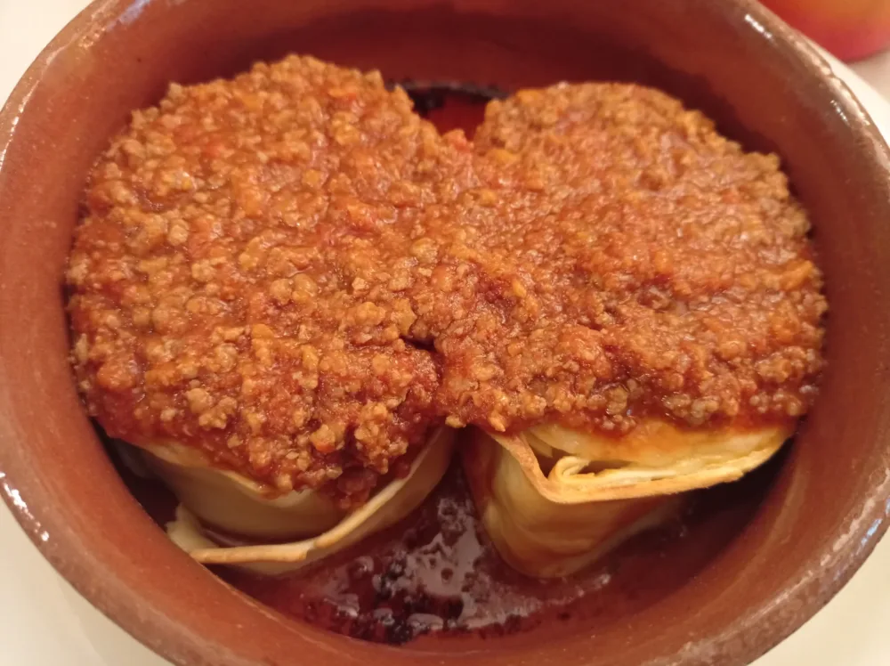 *** nella foto in apertura di post la mia mezza porzione del piatto simbolo del ristorante La Chioccia d’Oro, I Nidi, in un tegamino di coccio, da oltre quarant’anni, vengono serviti ai fortunati avventori due rotoli di pasta fresca (farcita con besciamella, mozzarella e prosciutto) passati in forno e ricoperti di ragù di carne