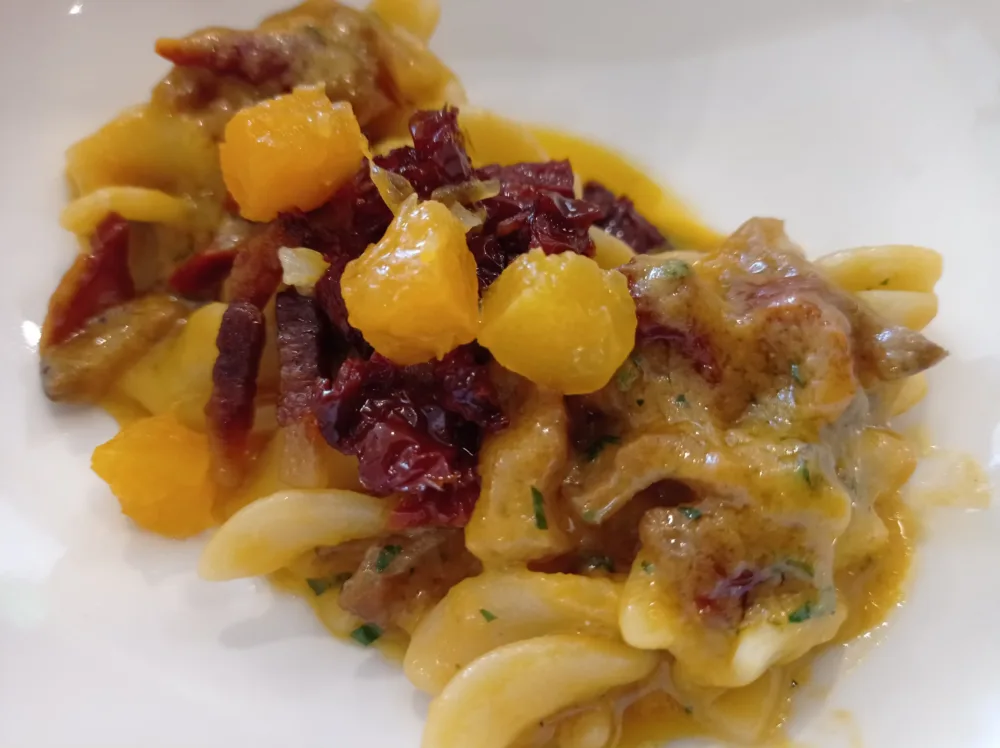 Ristorante La Chioccia d’Oro Fusillone di Gragnano con zucca, guanciale e pomodori secchi