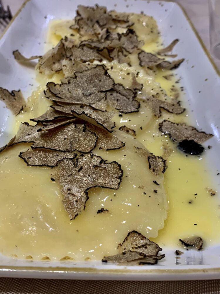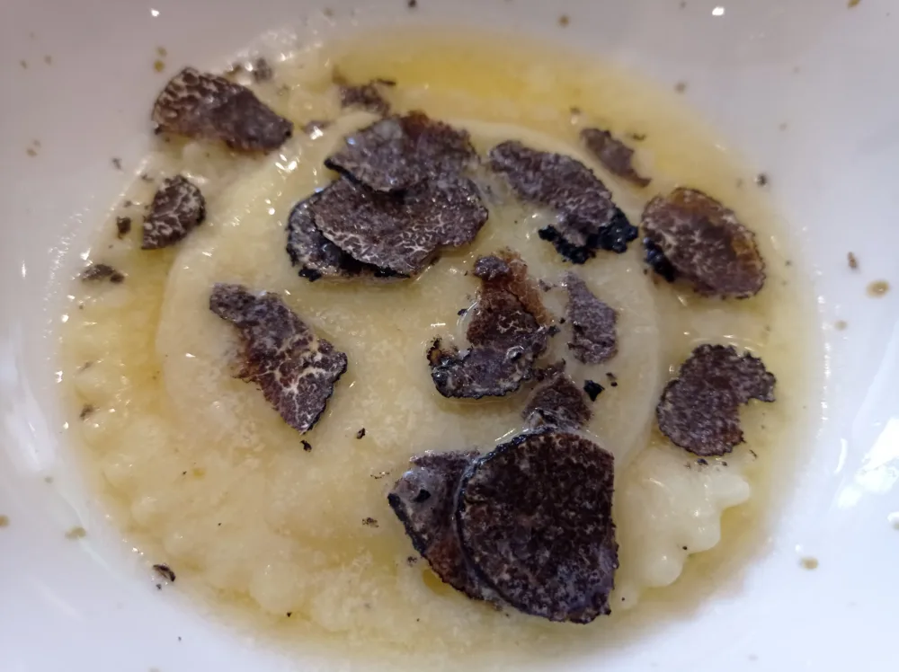 Raviolo alla ricotta con tartufo nero. 20,00 euro. Piatto iconico cilentano, delizioso, saporito egustoso.
