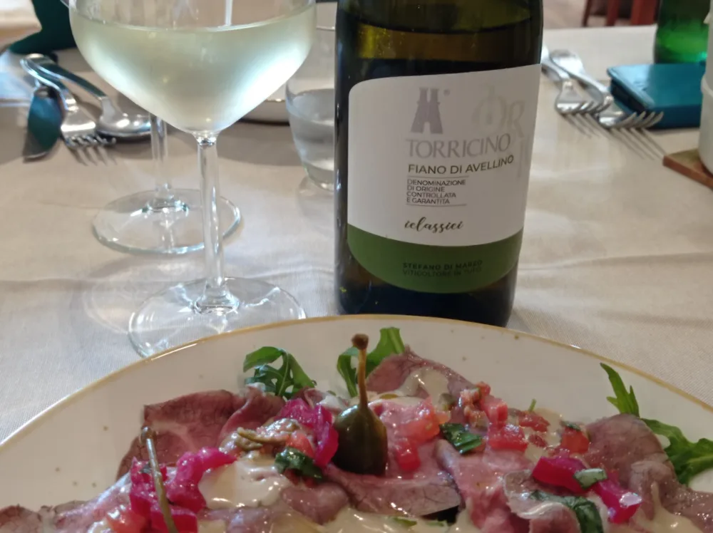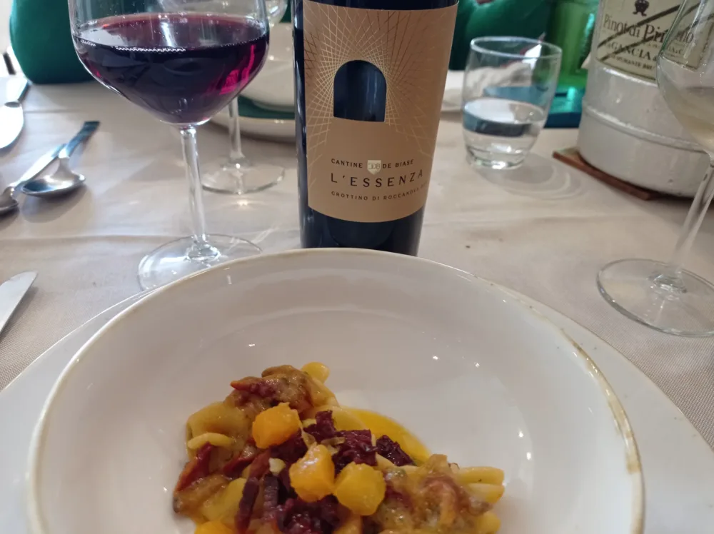 Per accompagnamento ho puntato su due pregevoli bottiglie di vino: il Fiano di Avellino Docg2023 di Torricino e L’Essenza Rosso Grottino di Roccanova Dop 2021 di De Biase.