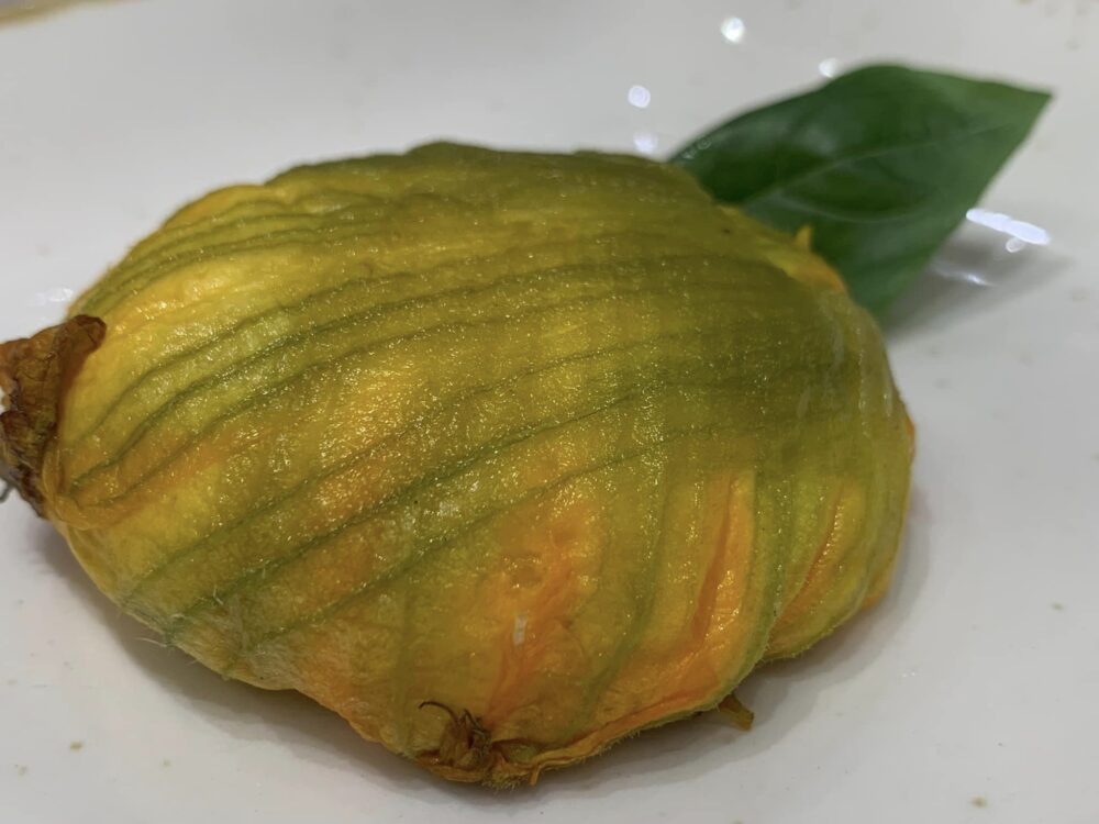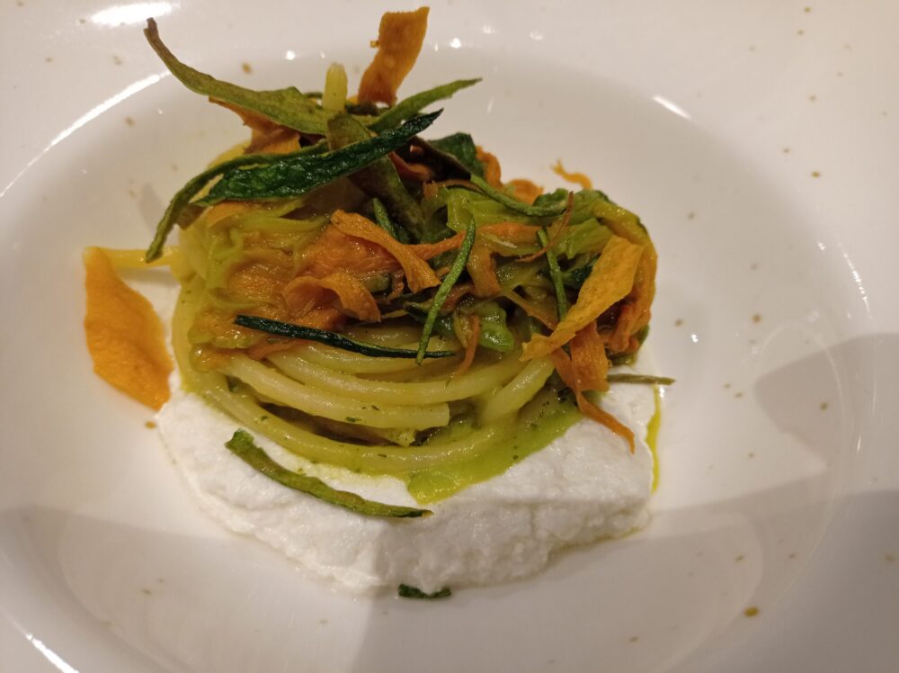 Ristorante La Chioccia d’Oro Bucatini con ricotta, crema di zucchine, fiori di zucca e zucchine a Julienne