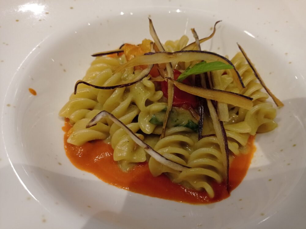 Ristorante La Chioccia d’Oro Fusilloni con pesto di melanzane, crema di datterini saltati, melanzane a julienne e ricotta salata