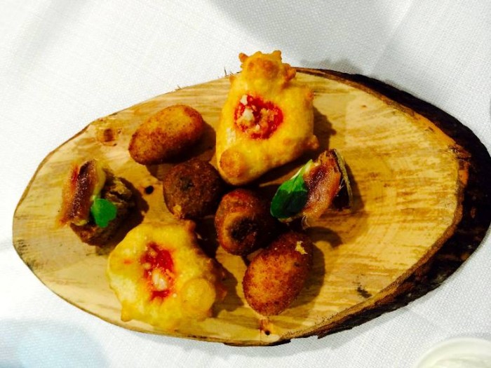 E così dopo il benvenuto (bruschetta pane, burro e alici; crocché di patate, polpetta di melanzane, montanare con pomodoro caciotta di pecora e germogli di rucola) e lo stuzzichino (pasta e fagioli ripassata con ristretto di totani), ecco la seppia poche, riso Venere e croccante alle alghe; mozzarella in carrozza con salsa di acciughe e riccio; friggitelli (peperoncini verdi di fiume) con baccalà mantecato, salsa di burrata, pomodorino infornato e limone candito.