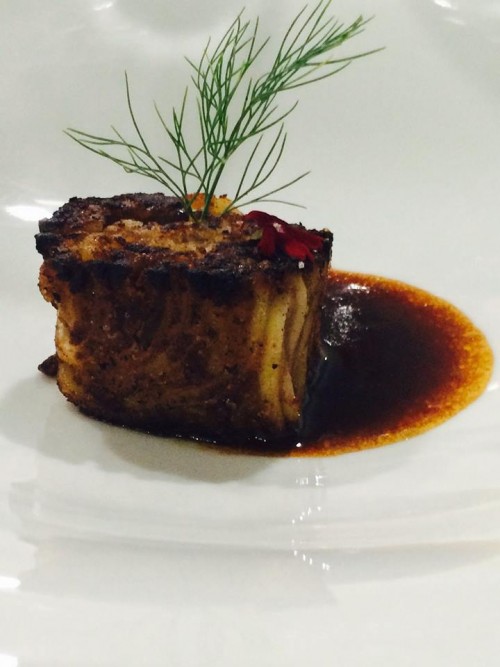 Arriviamo ai primi: fettucce con salsa di zucchine alla scapece e gamberi; gnocchi di patate e salvia con riccio e consommé di zucchine e zafferano; spaghetto al limone, con olive, muso e rucola.
