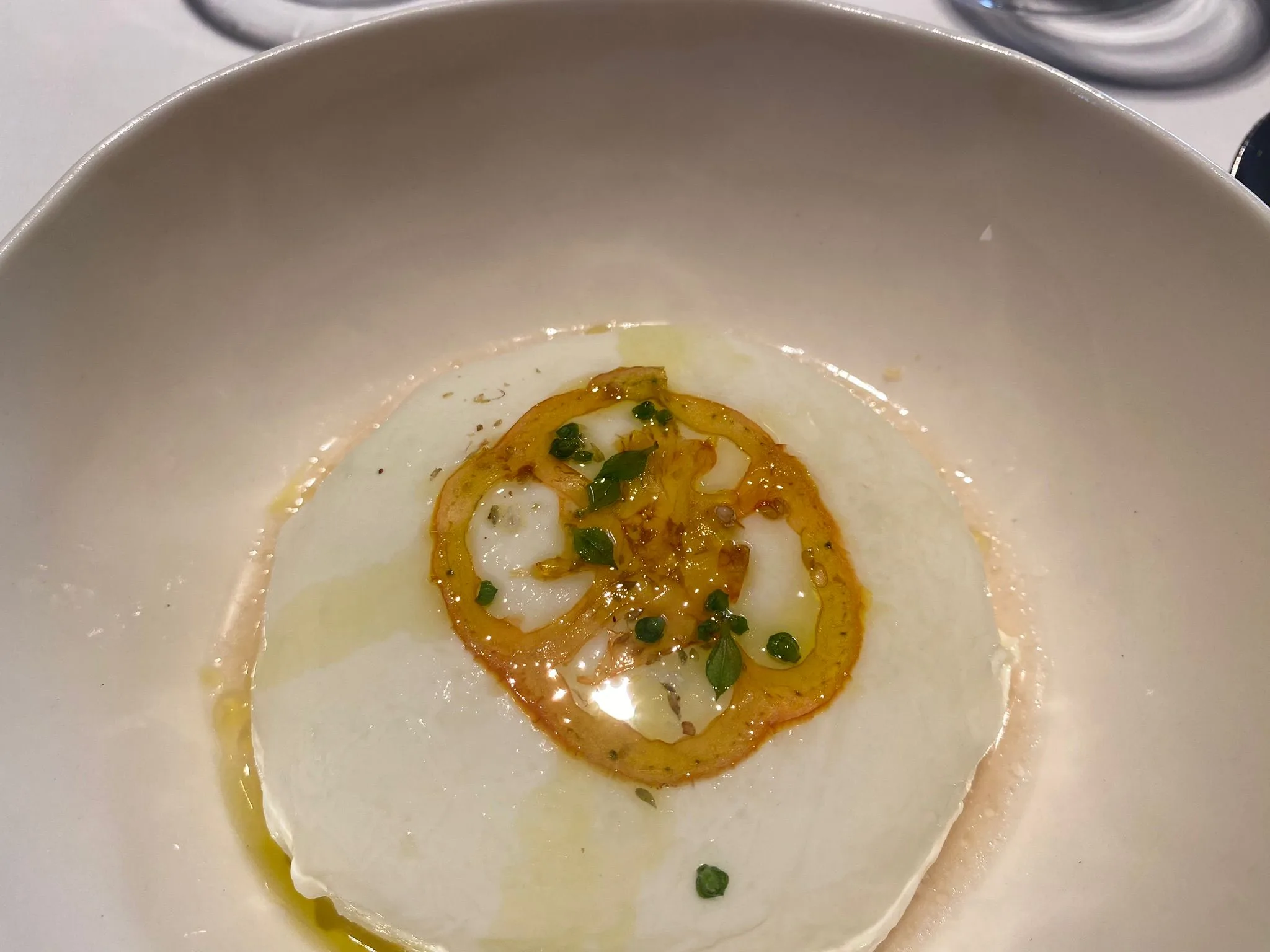 << ll piatto è nato osservando la pellicina che si forma sul latte quando bolle. Lo stavo preparando per una bagna càoda – spiega Cuttaia – e la pelle che si è creata durante la sua cottura mi è sembrata così perfetta da contenere una mozzarella al suo interno”. La lavorazione è complessa: mozzarella centrifugata con l’aggiunta di panna e voi avvolta nella pellicina di latte. La finta mozzarella è servita su acqua di pomodoro e completata con il pomodoro “da insalata”, l’elemento croccante per niente scontato.