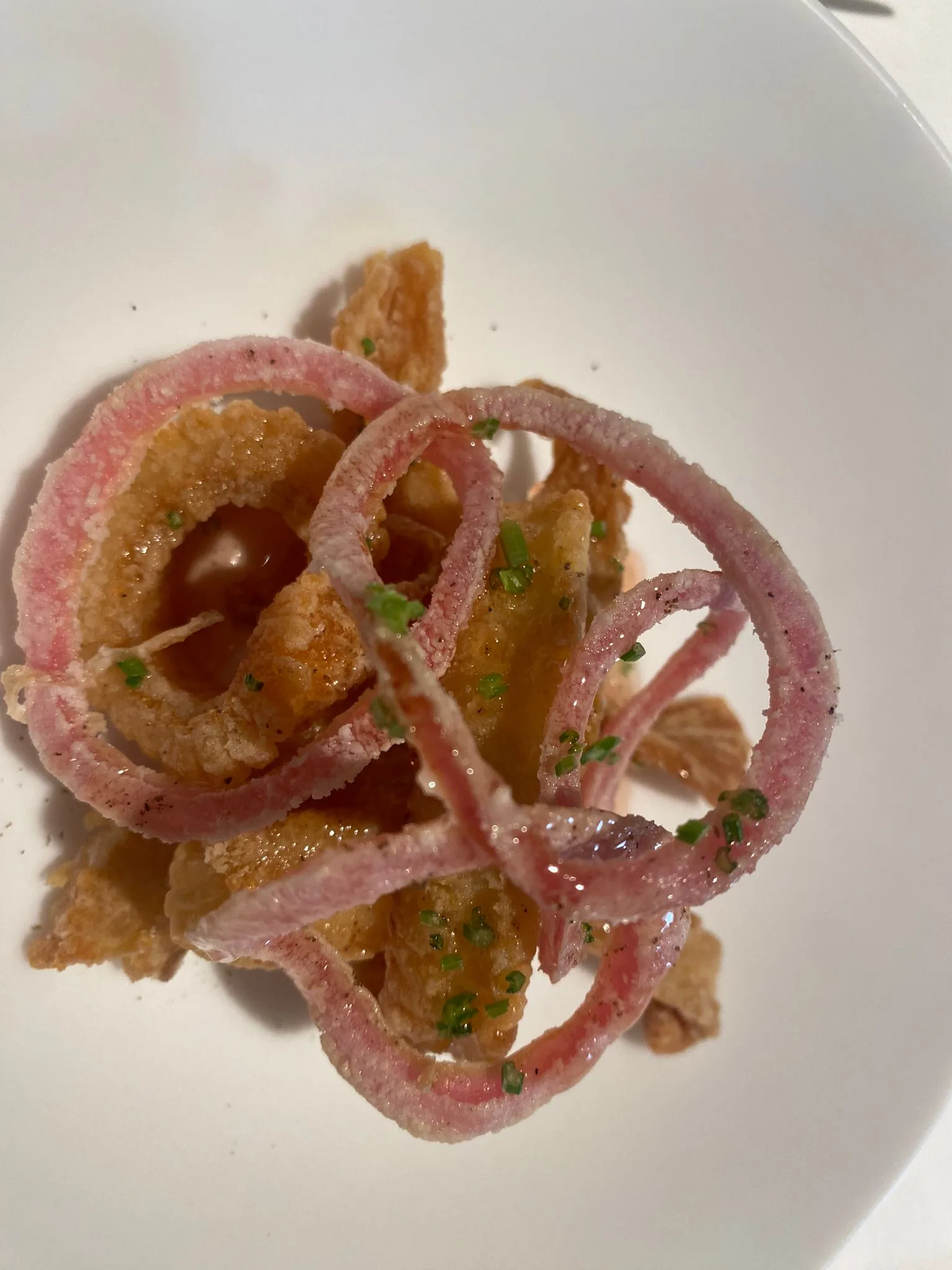 Iniziamo dalla Razza con chips di cipolle rosse in carpione. Era la merenda che si usava portare in campagna, il pesce senza spine accompagnato dalla cipolla in carpione ad ammorbidire il pane. Inizia, così, il viaggio nella memoria di Pino che è un po’ anche la nostra.