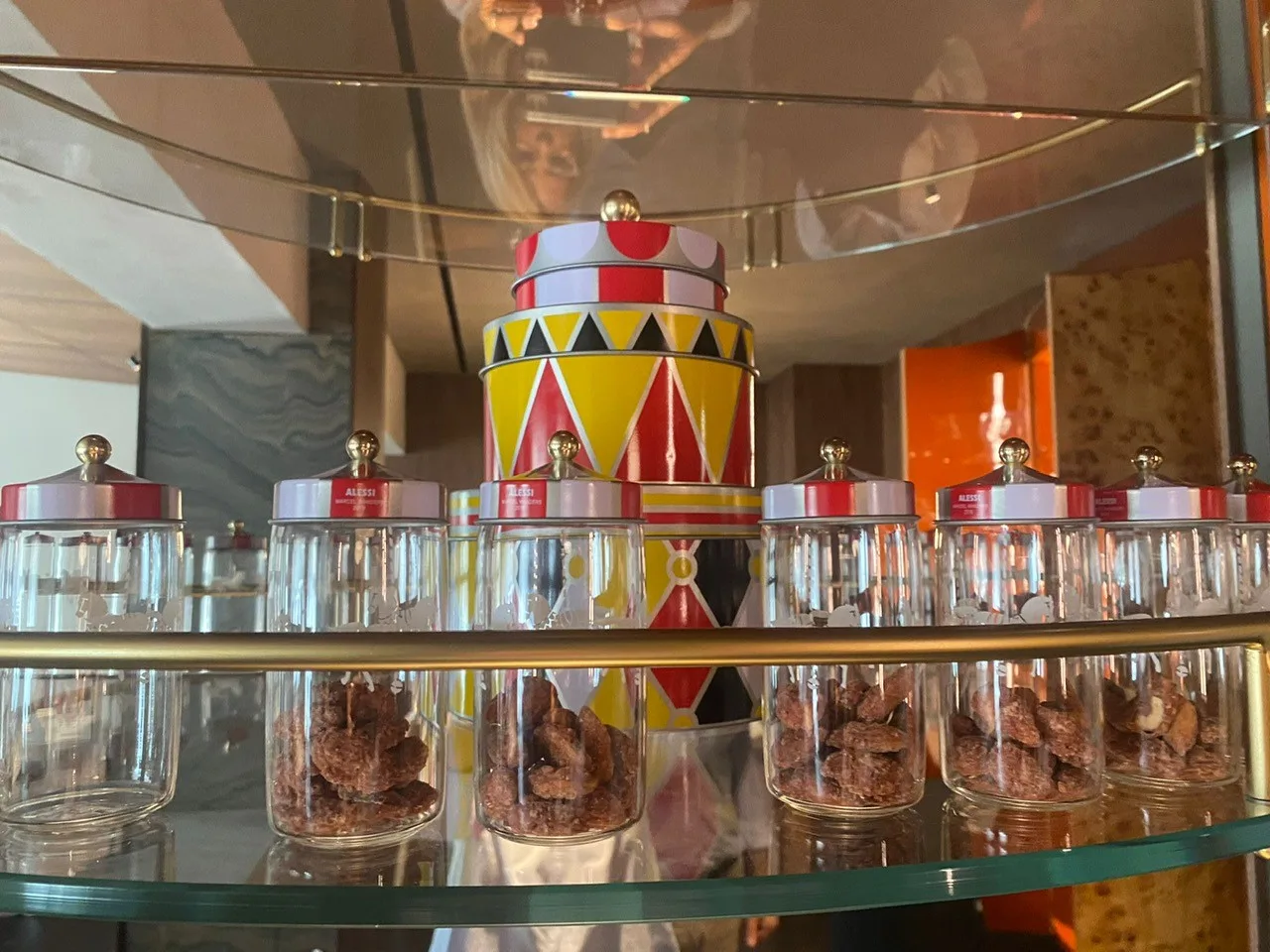 L’ambiente, totalmente rinnovato, parla di Sicilia, ma attenzione, non quella barocca o fatta di stereotipi, teste di moro e similia tanto per intenderci: qui tutto è ‘pulito’, i sensi non devono distrarsi ma rimanere concentrati su ciò che si mangia. Gli interni sono stati curati dal talentuoso architetto agrigentino Fatima Costa, che ha scelto tre elementi, tutti presenti in natura, il legno, il ferro ed il marmo. Ad impreziosire la sala, sculture e quadri d’autore di artisti siciliani. Originalissimo il rimando al monastero delle monache di clausura di Santo Spirito di Agrigento, con la ruota che da un lato contiene piccola pasticceria che richiama quella conventuale, come le mandorle sabbiate, mentre dall’altro un bar anni Settanta.