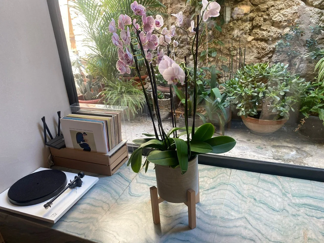 La luce filtra, discreta, da una vetrata che delimita un piccolissimo giardino di piante grasse a cui fanno da contraltare, all’interno, magnifiche orchidee curate dalla signora Loredana sommelier e compagna di vita di Cuttaia.