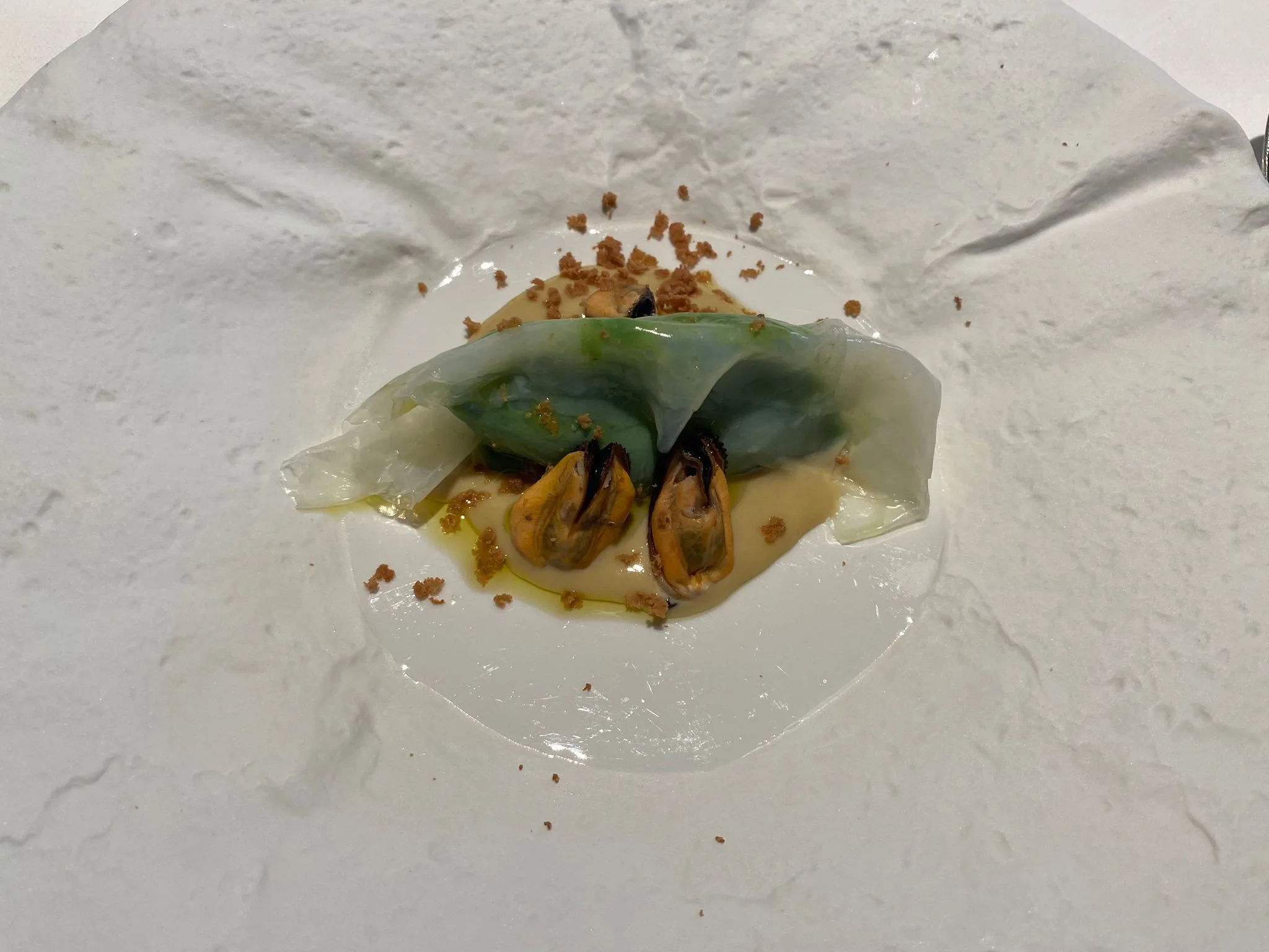 Candida spuma di acqua di frutti di mare che rappresenta la mareggiata, raviolini di seppia farciti di riccio, a riprodurre la fanchiglia che rimane nel guscio cozze frullate e lenticchie di Ustica disidratate e fritte.
