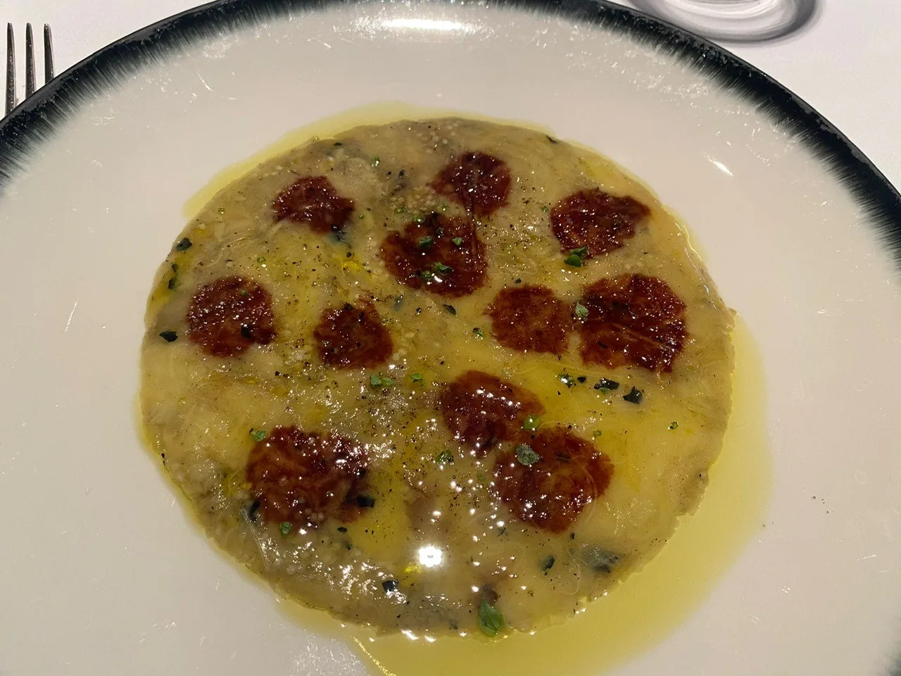 Sentori di affumicato anche nella Scampagnata di melanzana. Nasce dal ricordo delle melanzane arrostite sulle braci del forno a legna quando si terminava di fare il pane, un rito che avveniva in genere in campagna, da cui “scampagnata”. All’assaggio, viene fuori tutta l’importanza della tecnica della stratificazione in cucina. Lo chef ci porta l’esempio del tartufo: una cosa è addentarlo, un’altra gustarlo a lamelle. E così avviene anche con la melanzana.