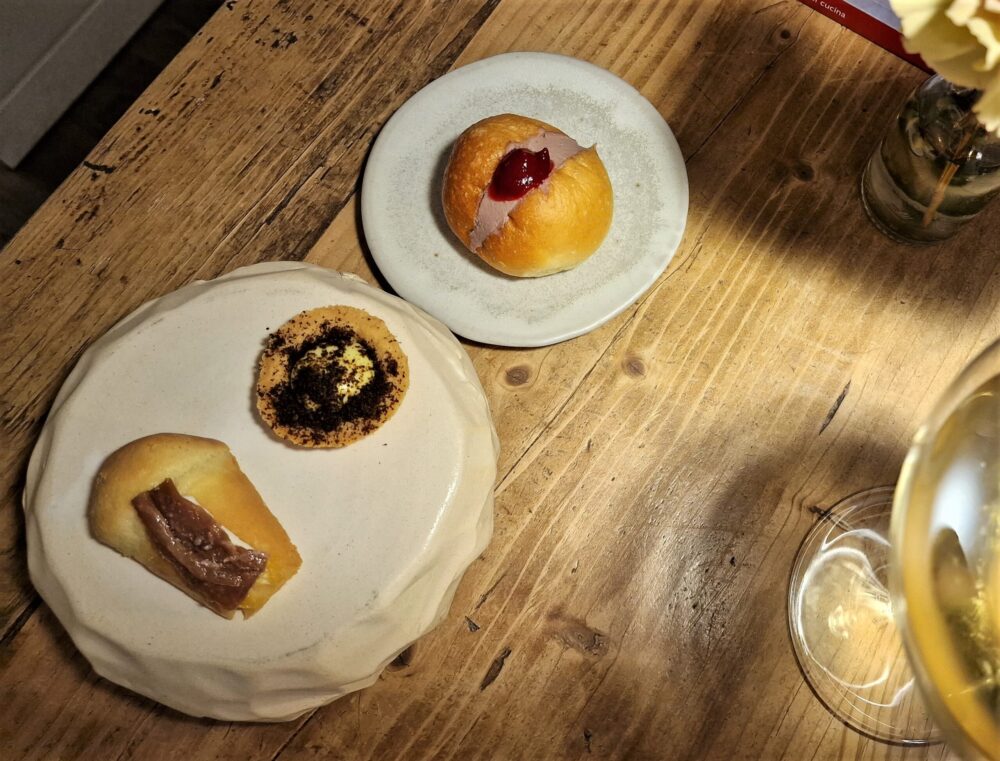 Il benvenuto offre una contaminazione nello spazio, tra territori, e nel tempo, visto l’ammorbidimento della tradizione: sempre divertente il maritozzo di fegatini e polvere di lamponi, ottima la tartelletta al cavolo romano e cipolla bruciata con una frolla da manuale e goloso il babà all’acqua di cozze con acciuga e crema di burrata. I pani sono variegati e ben pensati: lievito madre, alle noci, grissini e una pericolosa galletta al farro.