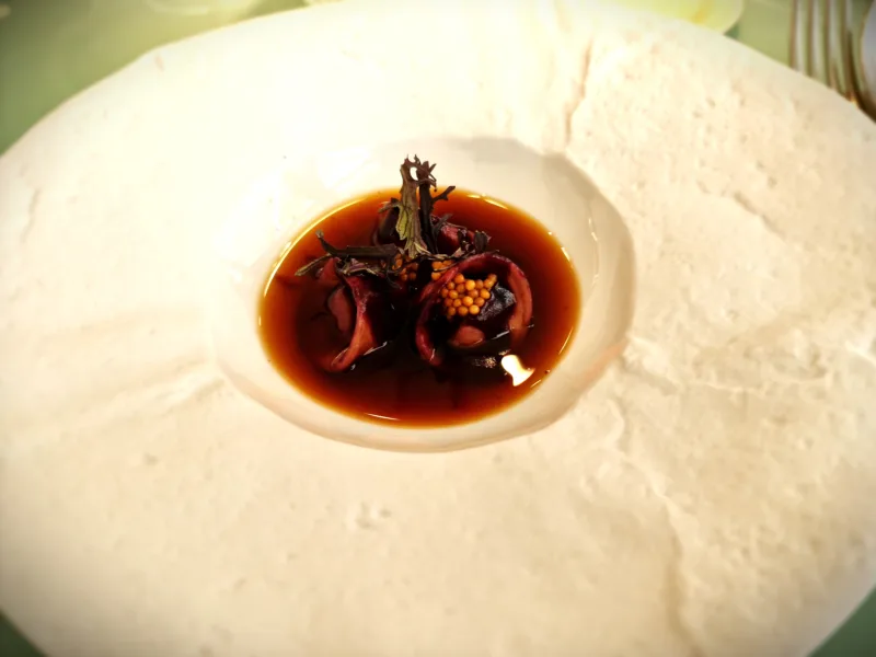 Marco Lagrimino non è un autodidatta ma è evidente che il suo bel percorso – ne avevamo scritto qui Ristorante L’Acciuga a Perugia e la cucina di Marco Lagrimino (lucianopignataro.it)– gli sia servito per affinare la sua idea di cucina; una cucina innanzitutto precisa, senza sbavature e senza eccessi, in una parola: misurata. Un esempio su tutti, in occasione della mia recente visita, dello sgombro marinato con carciofo e riduzione di Cynar.