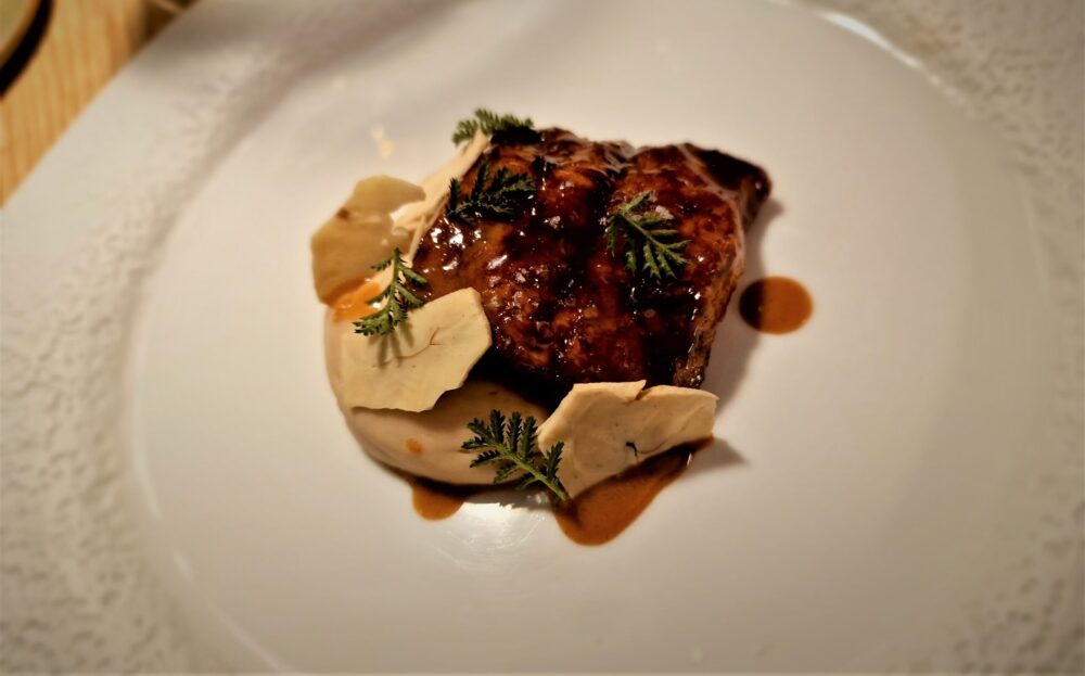 L’anguilla si lega benissimo alla castagna e con la laccatura è golosa; il morso sgrassato dal ginepro piuttosto imponente.