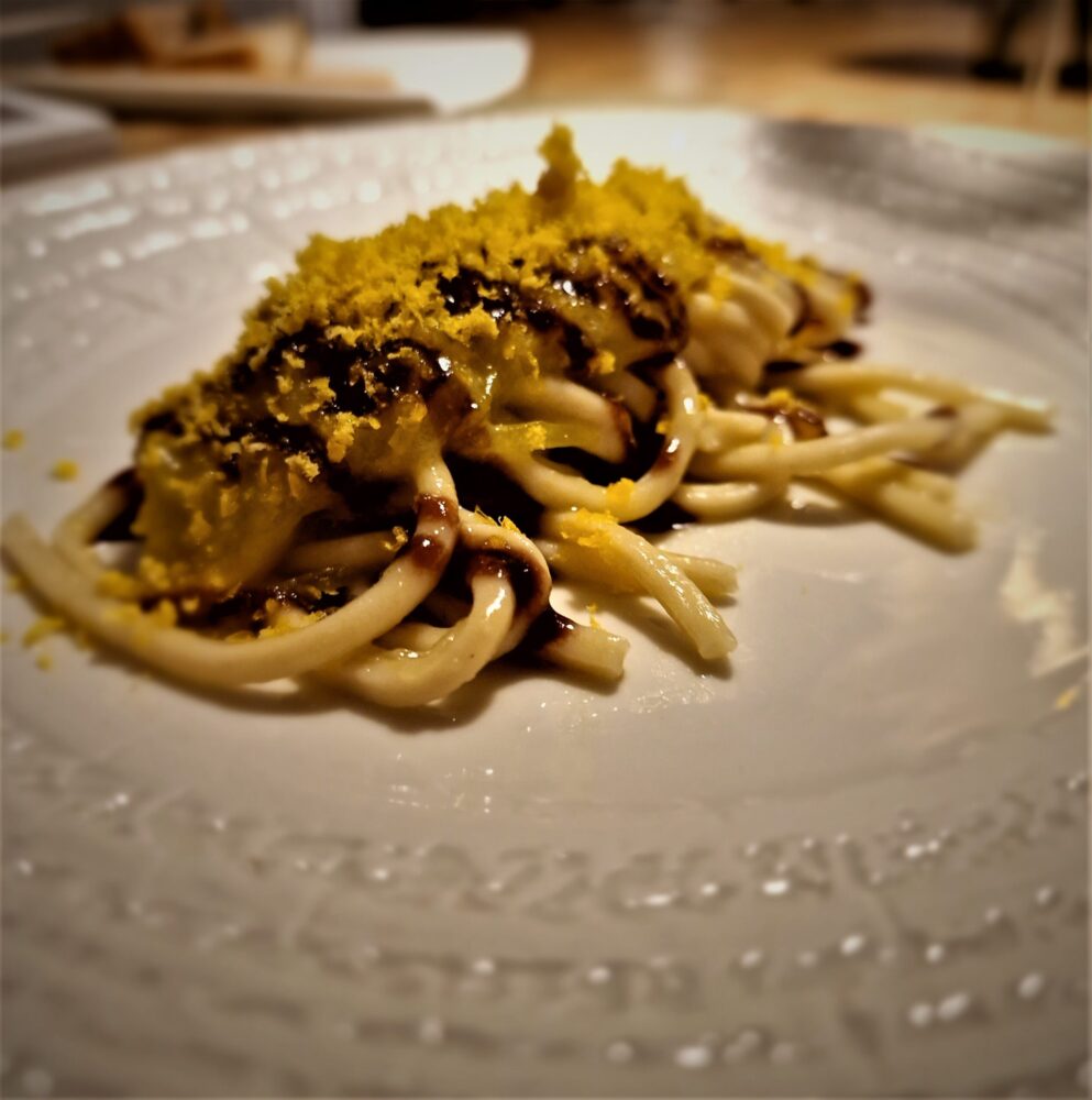 l’acciuga Perugia – spaghetti alla chitarra, sedano, cipolla di cannara, tuorlo affumicato