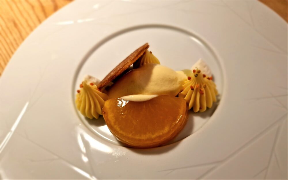 La bavarese al finocchio prepara il palato al dessert: millefoglie di mela, miele di castagno, polline, mascarpone, cialda e gelato al sidro di mele col giusto equilibrio dolcezze e acidità.