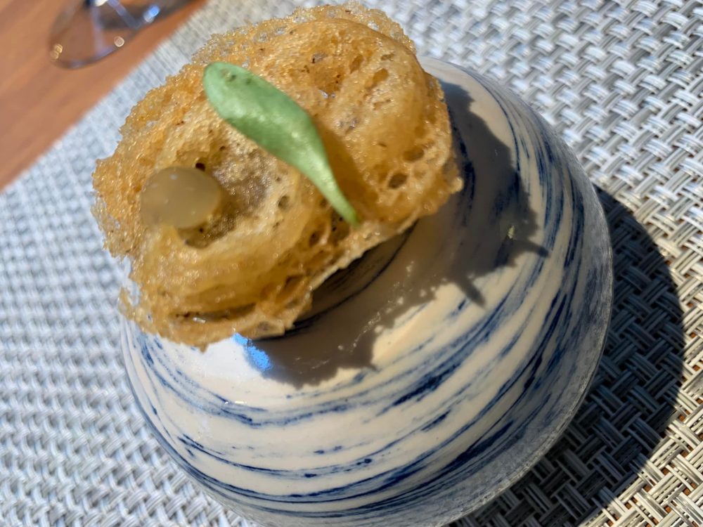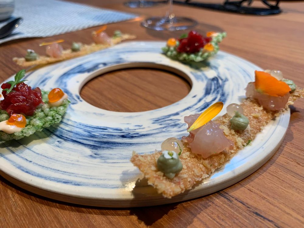 Il ristorante sta nell’Hotel Monument, al centro della città. L’arredamento p confortevole, essenziale, cucina a vista. Noi pranziamo nella saletta da otto dove si gode di una prospettiva dall’alto della cucina oltre che di faccia per alcune preparazioni. La carriera di Paolo Casagrande, classe 1979, è lineare: nato a Conegliano Veneto, si diploma all’Alberghiero di Vittorio Veneto, nel 1998 è a Londra, poi a Chateaux Neuf du Pape con Pierre Pommel e 3 anni a Parigi con Alain Solivérès. Da qui approda alle cucine di Martin Beratasagui nel 2003 per poi andare a Tenerife, dove nel 2009 ottiene la prima stella. Poi una tappa di due anni a Blevio, al Casta Diva Resort e infine l’ingresso a Lasarte di Barcellona, già bistellato, dove conquista la terza stella. Dei 42 anni, 20 sono vissuti in Spagna.