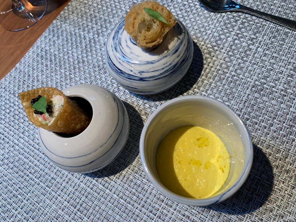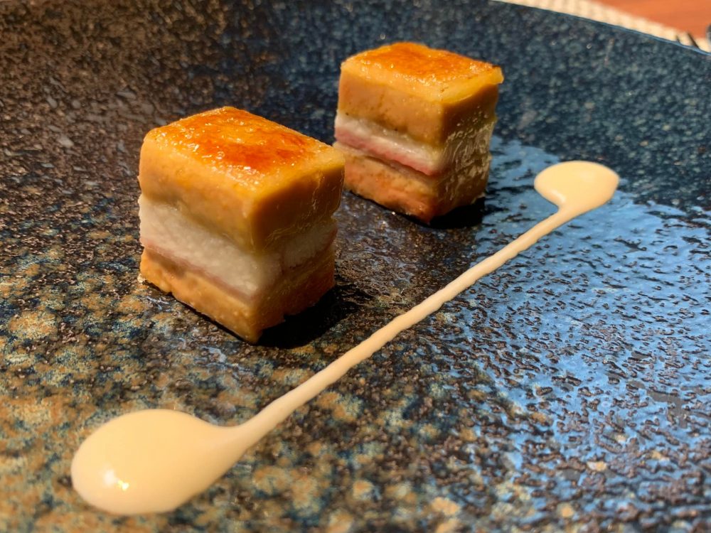 Lasarte a Barcellona, aperitivo, foie gras caramellato e anguilla