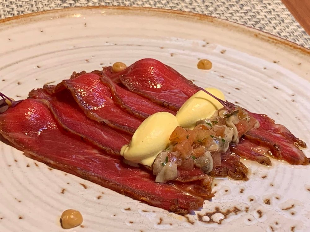 Lasarte a Barcellona, presa iberica con curd di foie gras, ostrica e gelato di mostarda