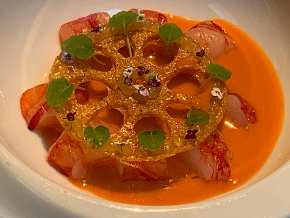 Lasarte a Barcellona, zuppa di gambero rosso, pomodoro, sedano e mela verde