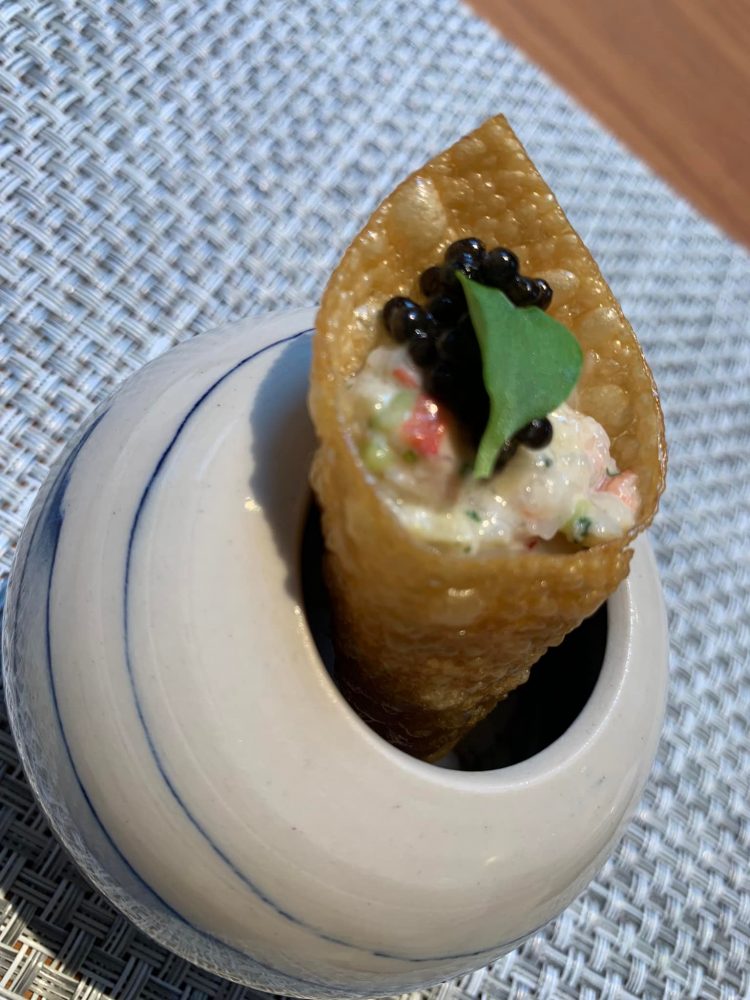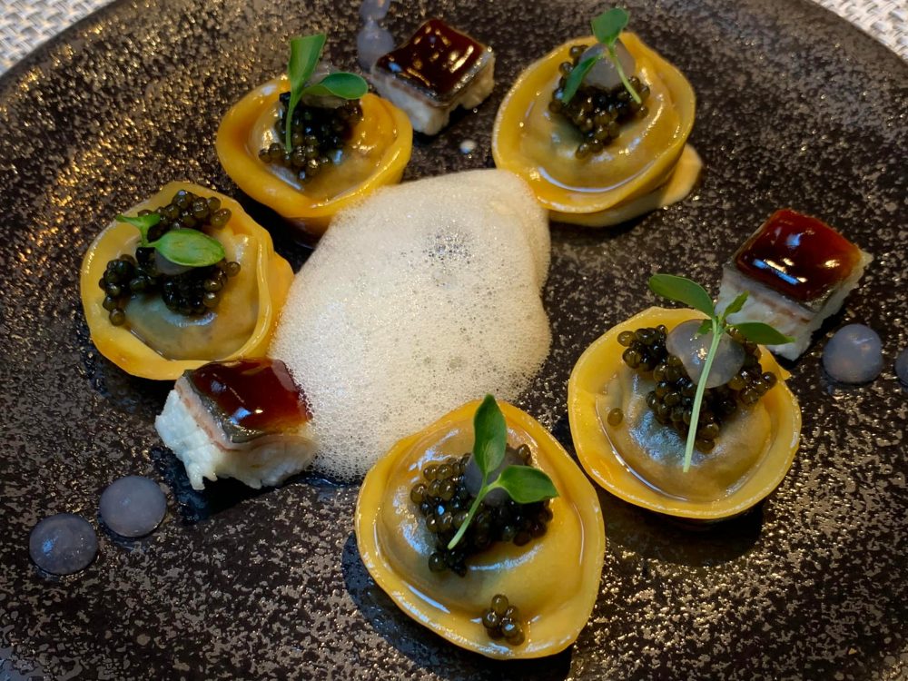 Lasarte a Barcellona, ravioli di wagyu con anguilla laccata, rafano e caviale