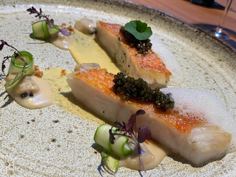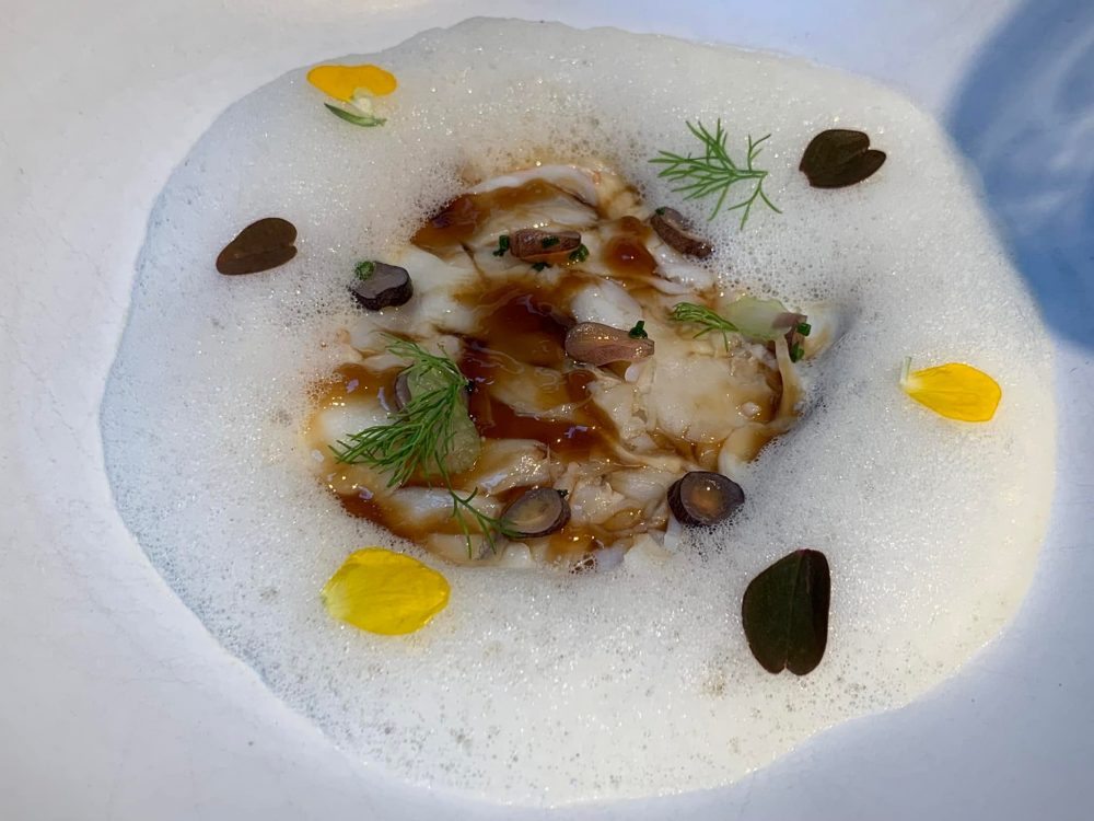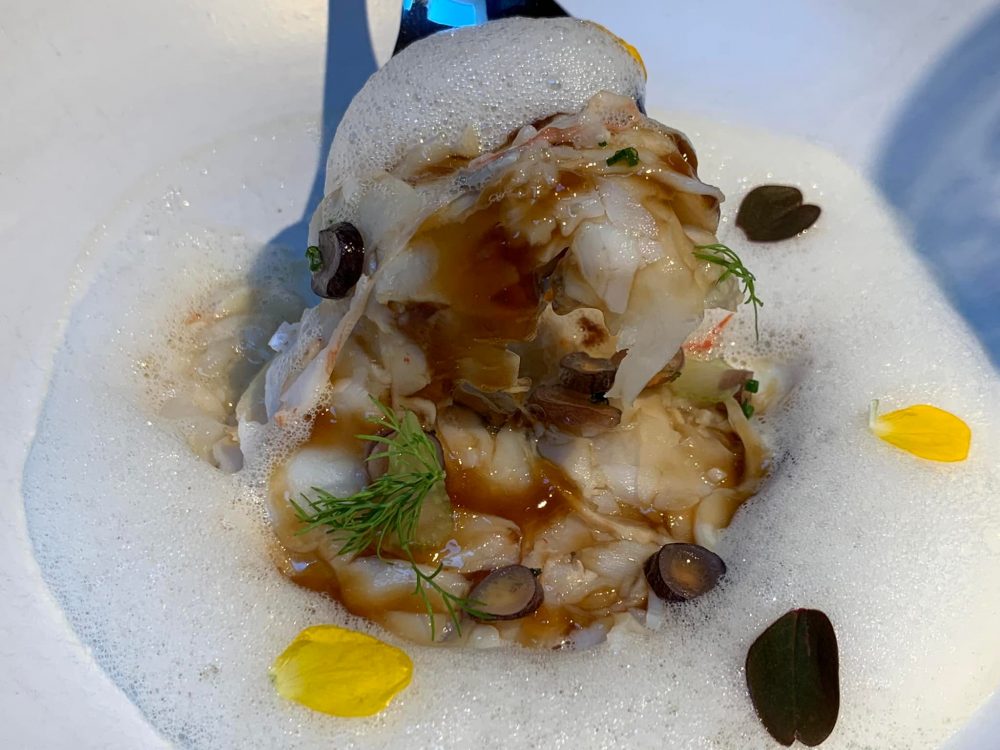 Lasarte a Barcellona, pesce virreo con vongole pil-pil con granchio, champagne e crema di nocciole