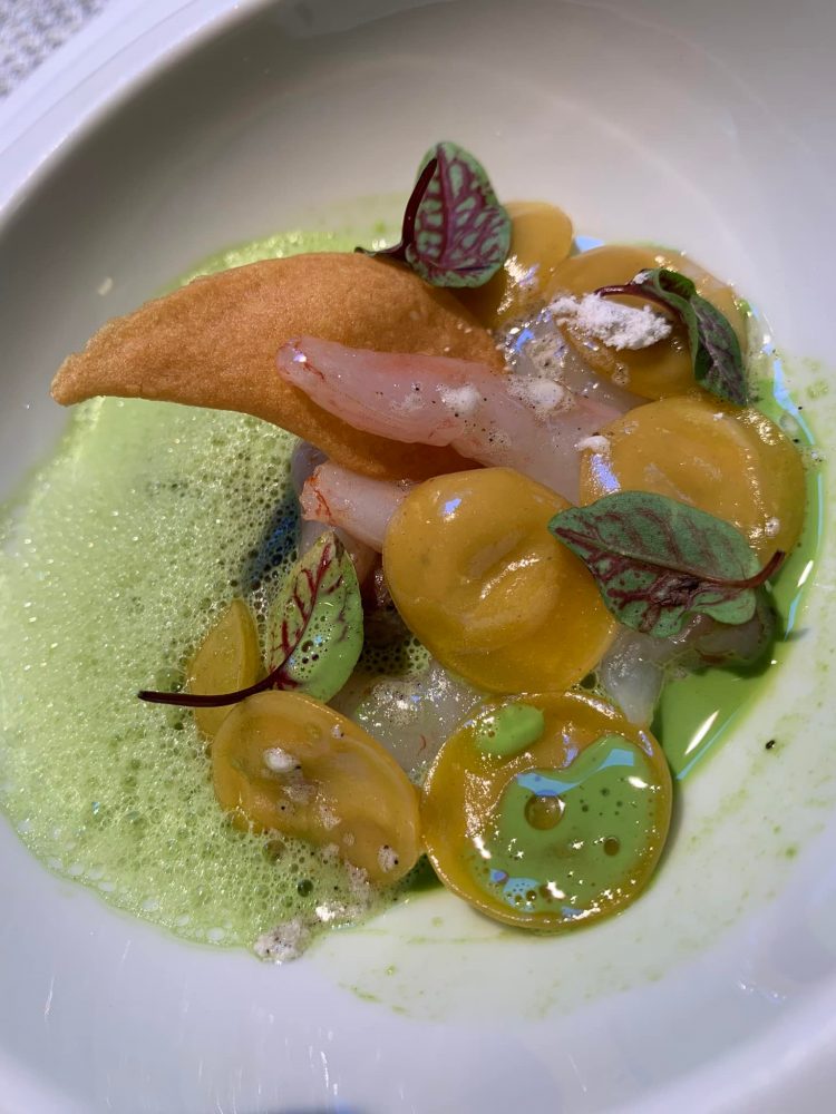 Lasarte a Barcellona, zuppetta di prosciutto ed emulsione di basilico con bottoni di pasta alla melanzana e gamberi