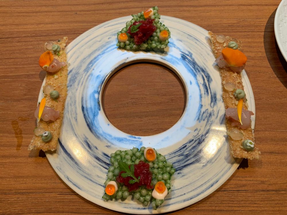 Lasarte a Barcellona, tartare di calamaro con tuorlo d’uovo, cipolla e concomme di kafir